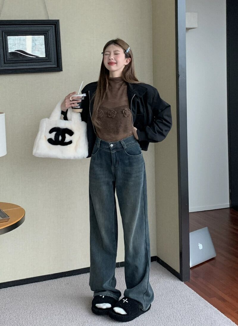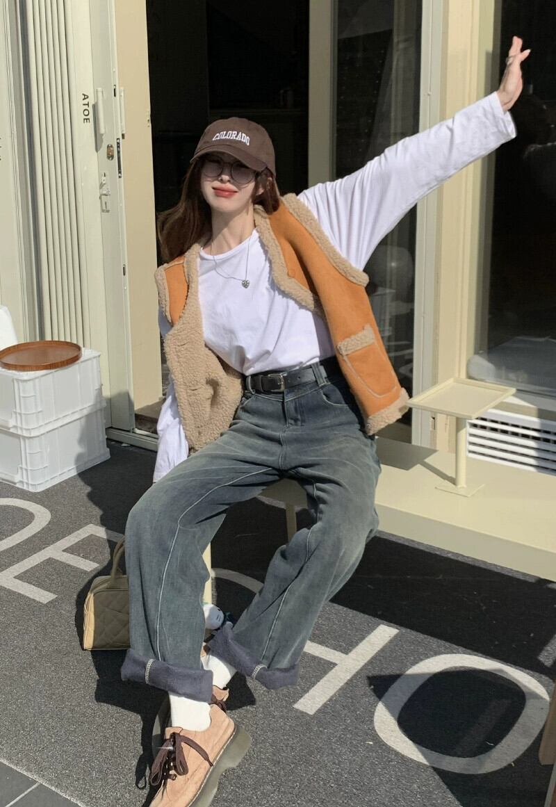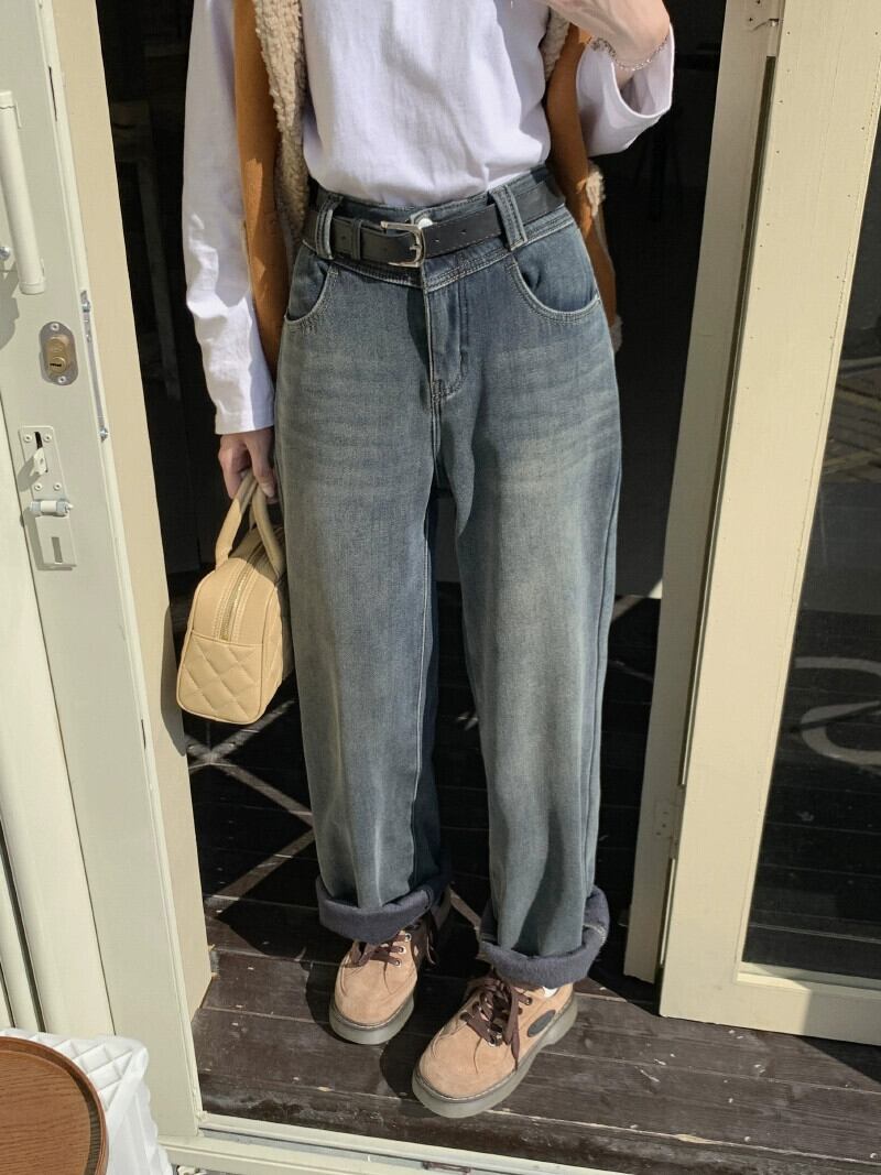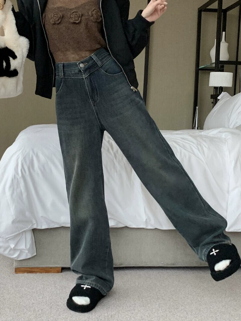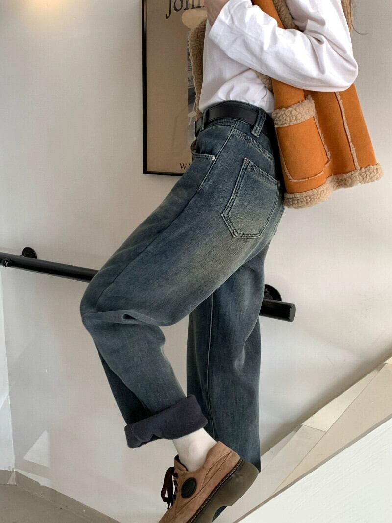 レトロブルージーンズの女性の冬のベルベット肥厚ワイドレッグパンツ 2024 新しいスタイルのハイウエストストレートフロアレングスパンツ ウィンター 冬物 8571634921250839