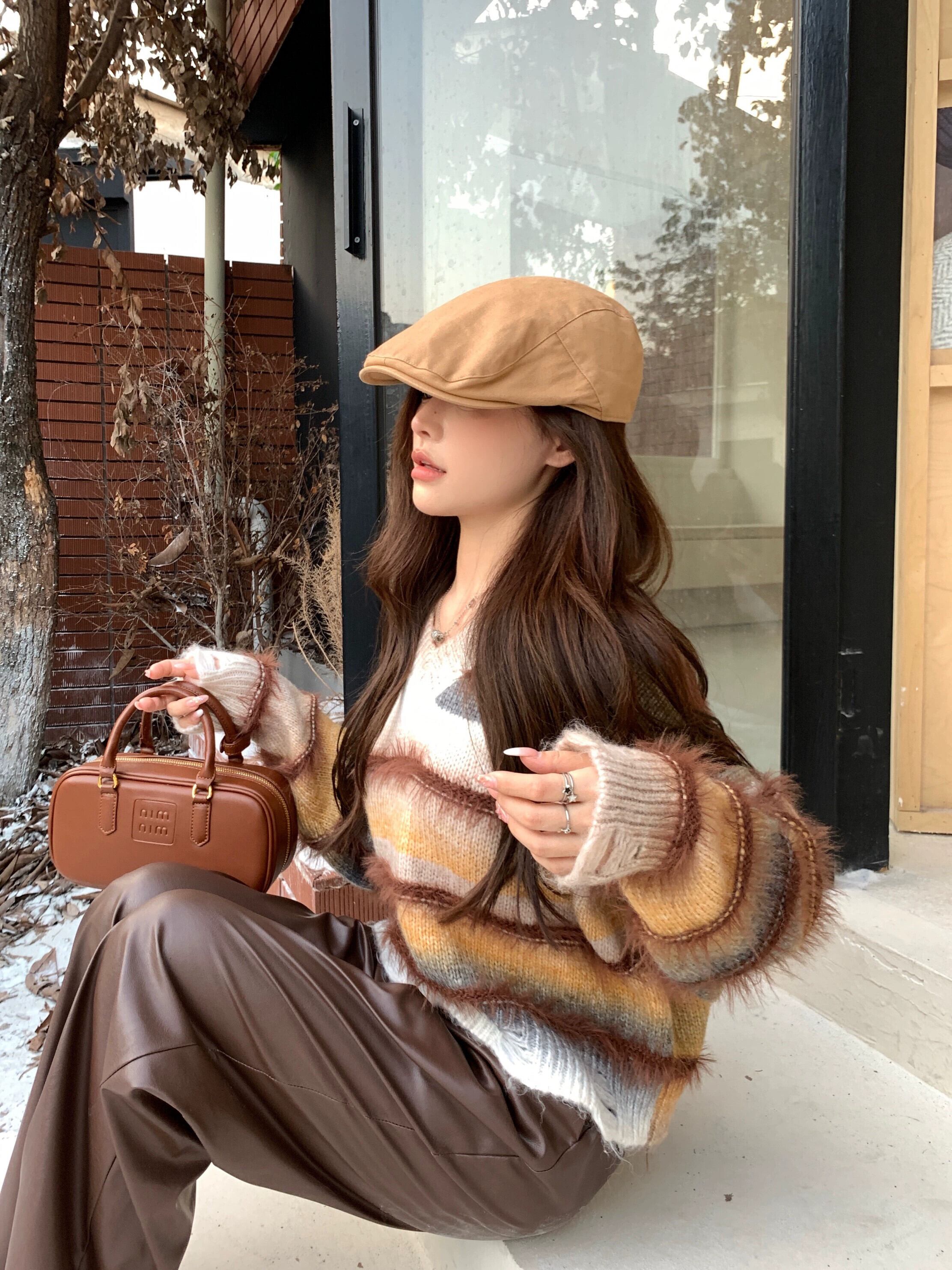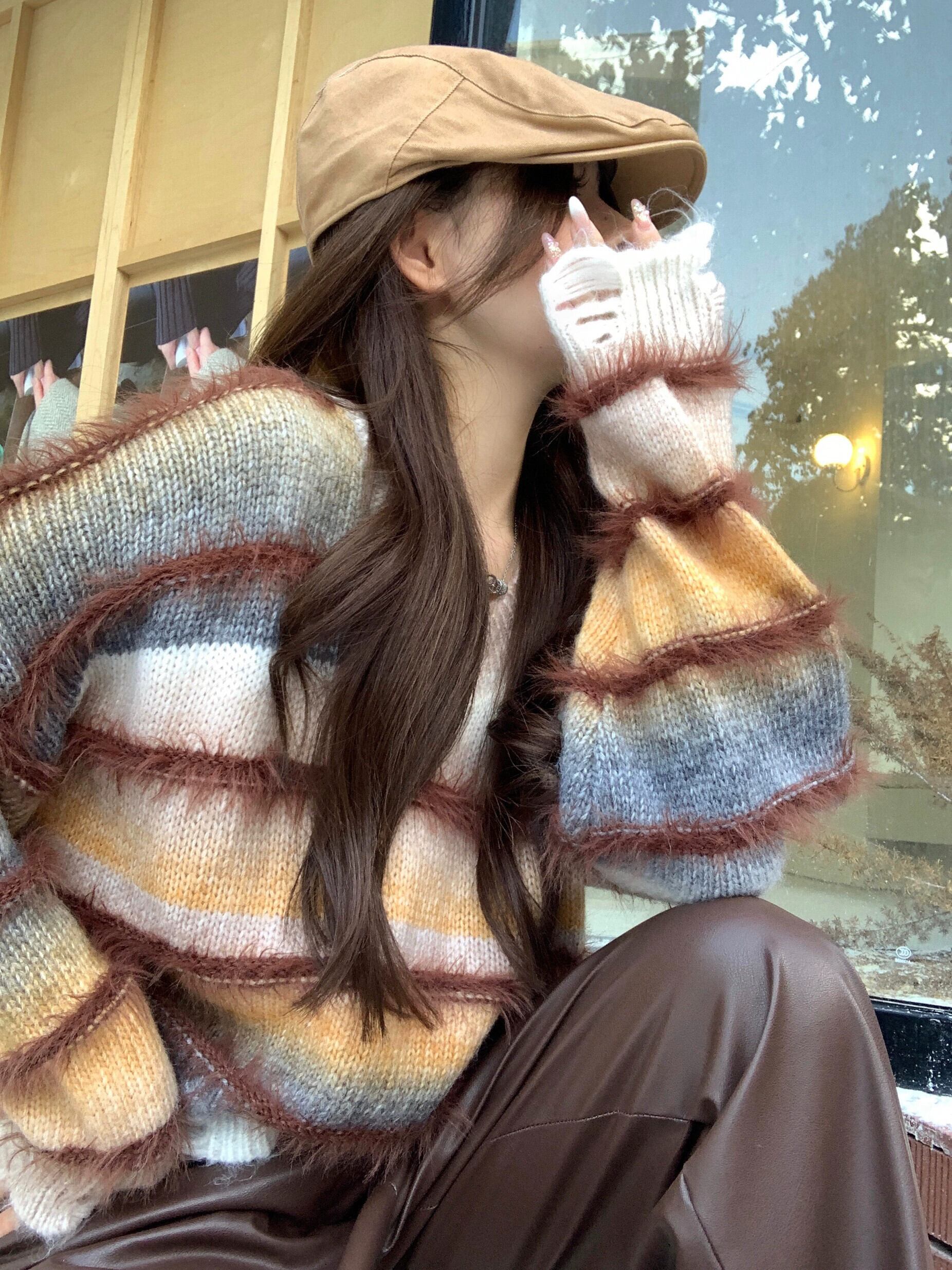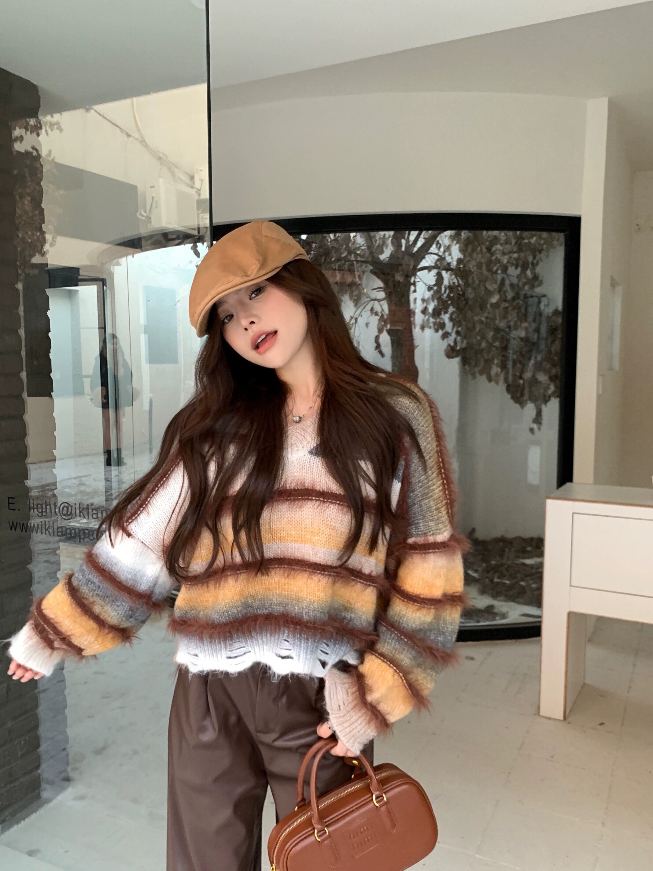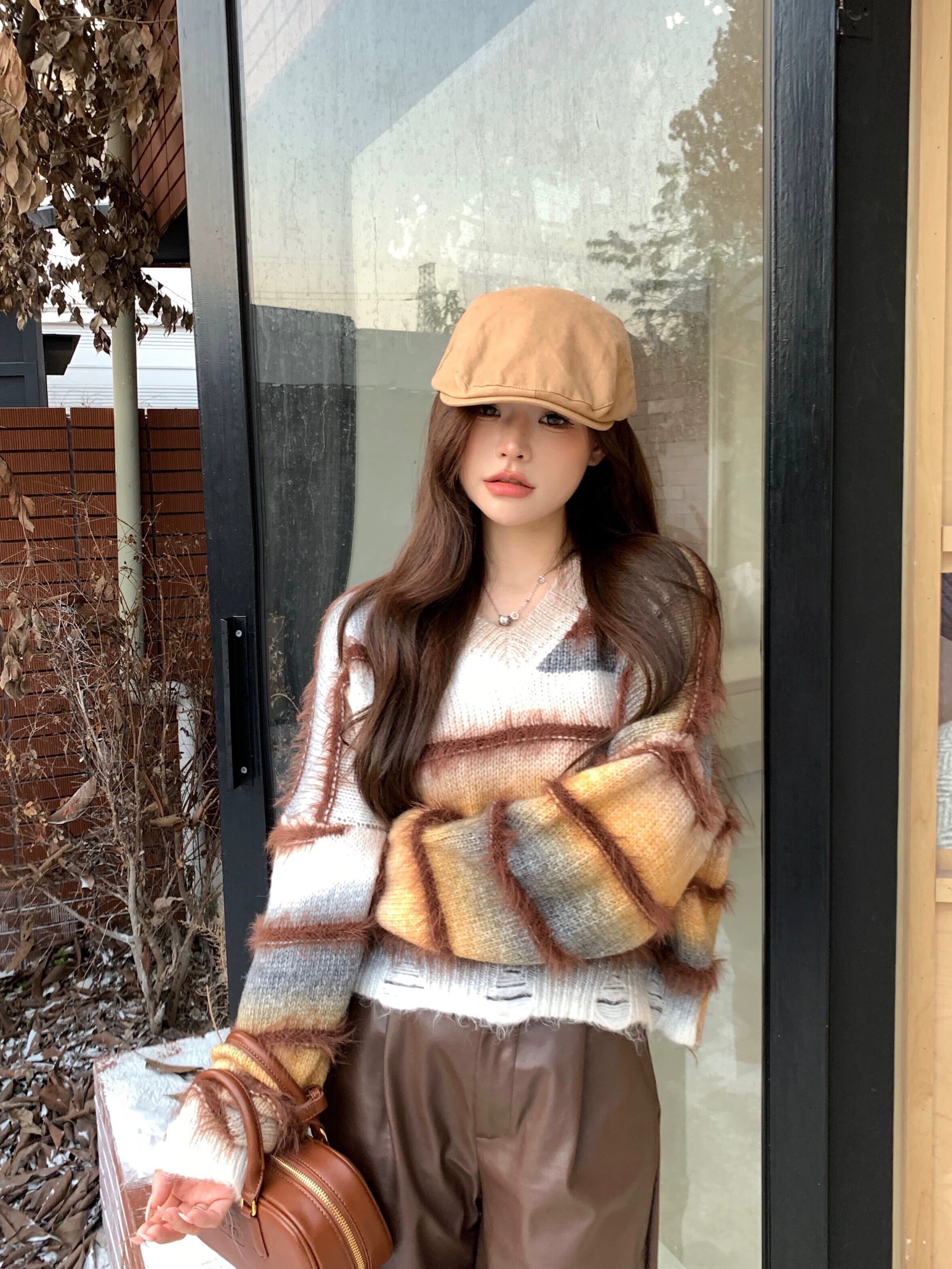 コントラストストライプのセーターの女性の秋冬メイラード着用 2024 新しいレトロなデザインの穴 V ネックセーター オータム 秋物 ウィンター 冬物 Vネック 8571620882519012