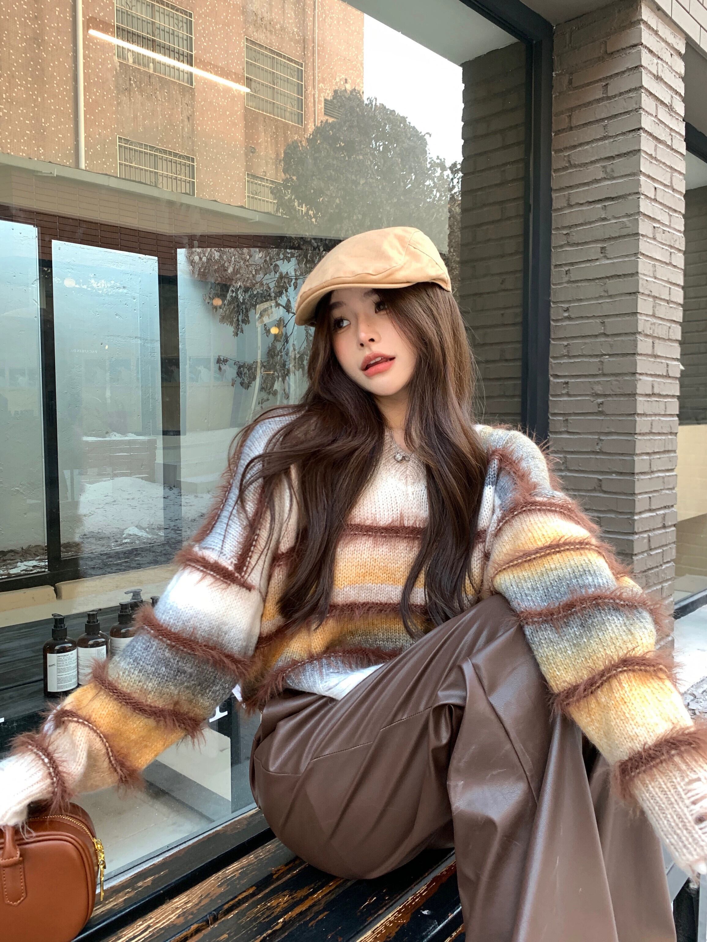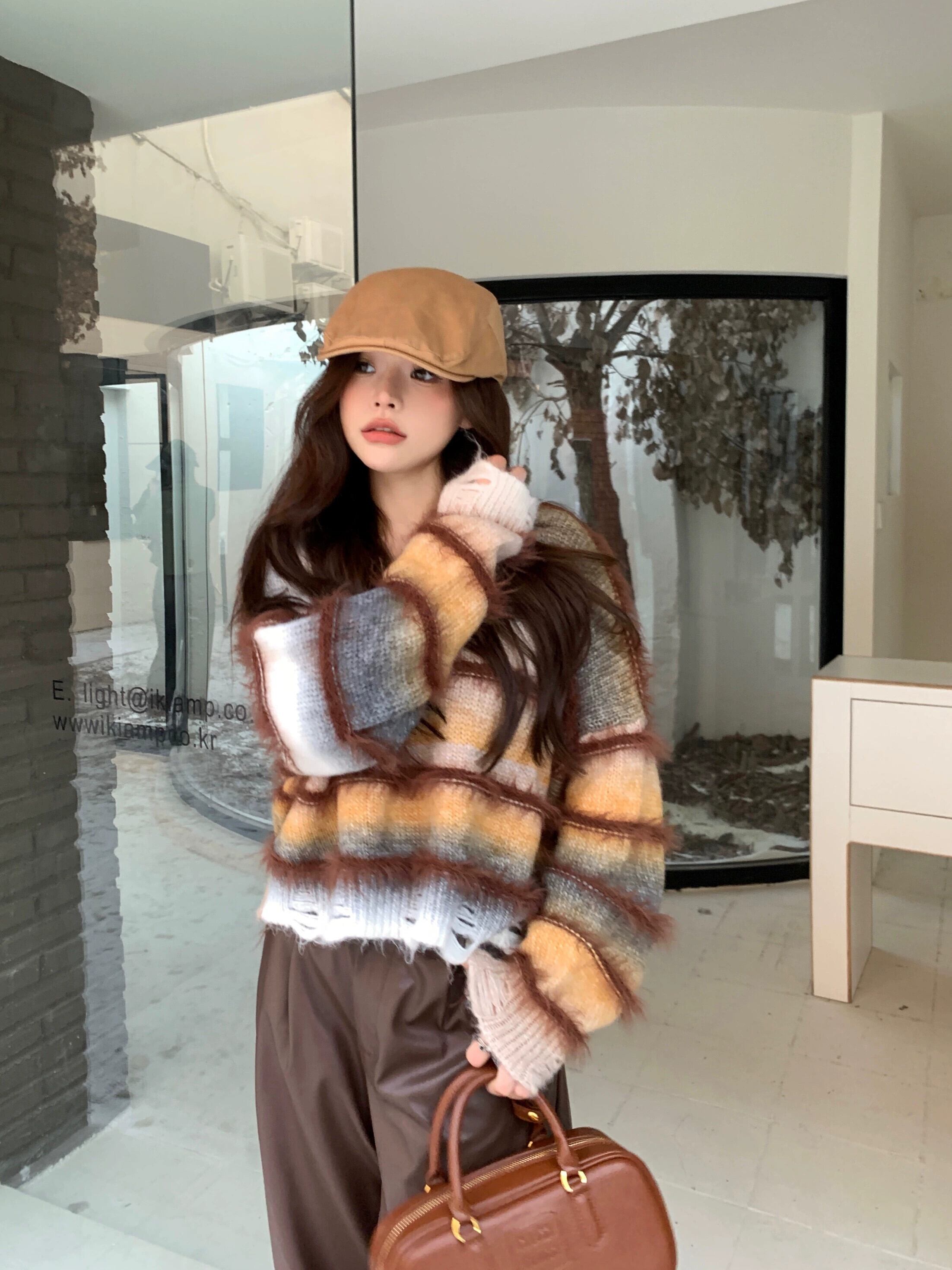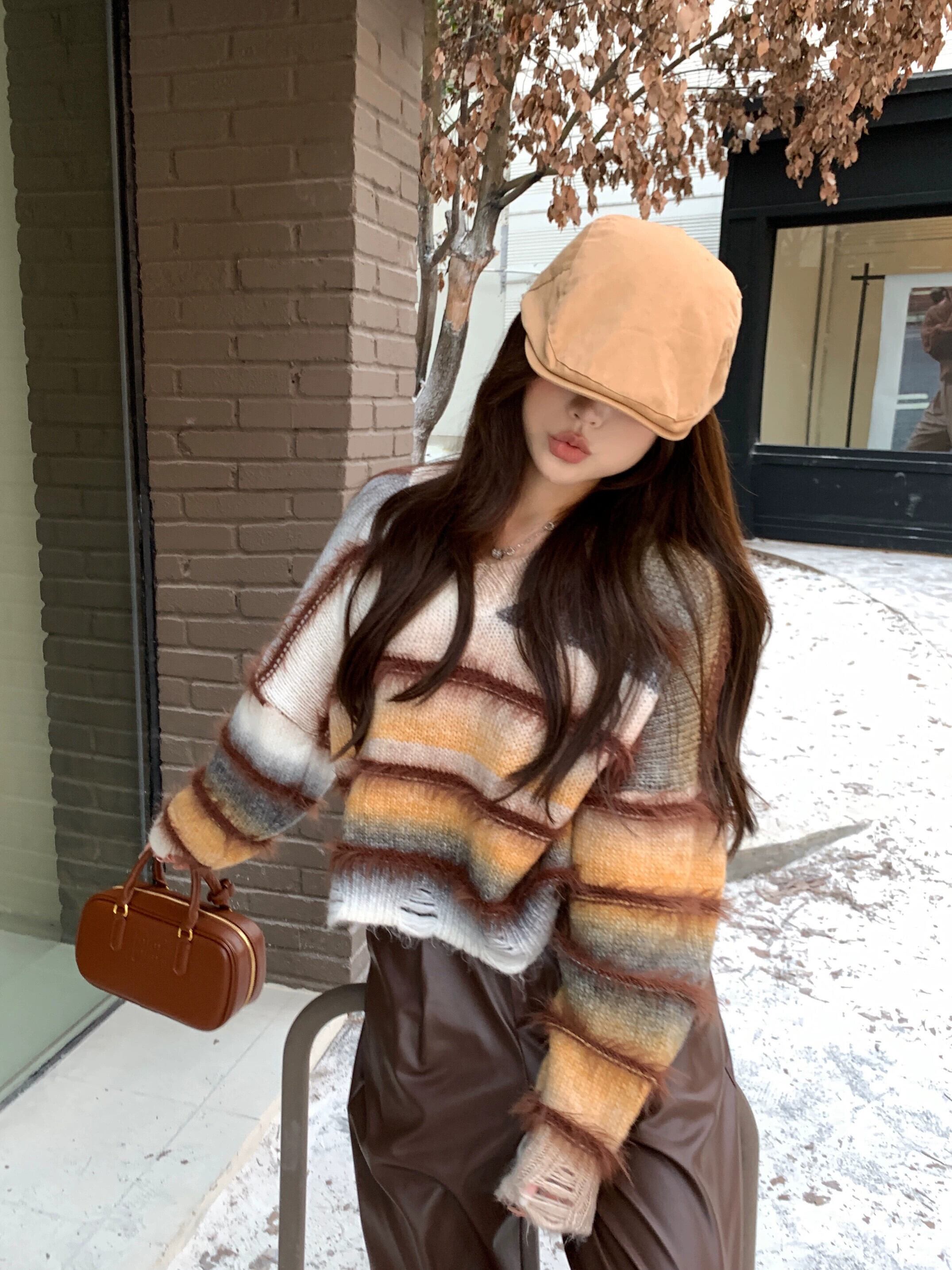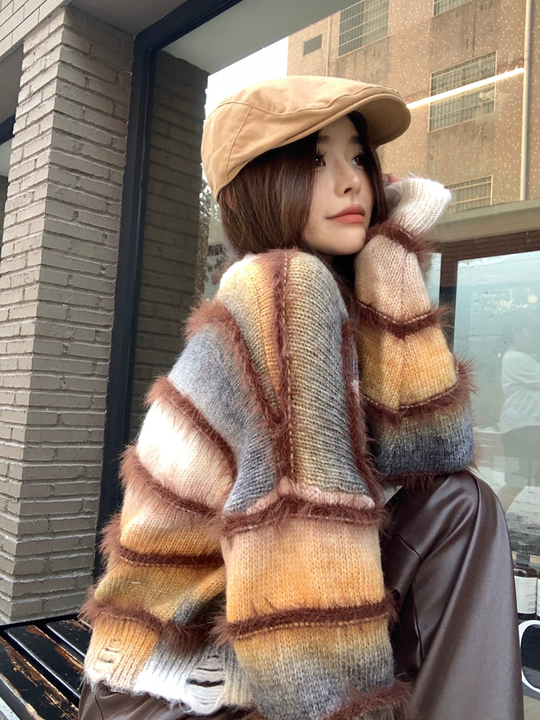 コントラストストライプのセーターの女性の秋冬メイラード着用 2024 新しいレトロなデザインの穴 V ネックセーター オータム 秋物 ウィンター 冬物 Vネック 8571620882519012