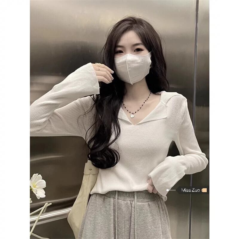 白いニットボトムシャツの女性、2024年の新しいスタイルのシックでユニークなスリムラペルトップが付いた秋冬のセーター ホワイト オータム 秋物 ウィンター 冬物 8571672966177240