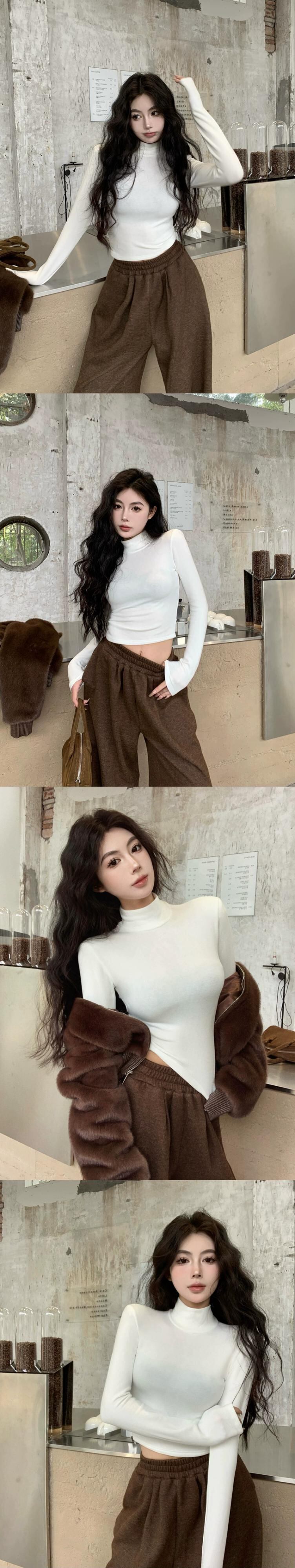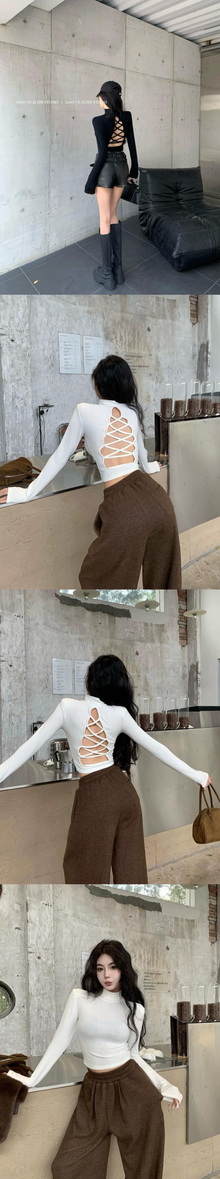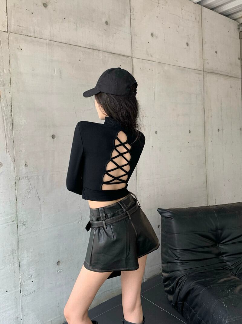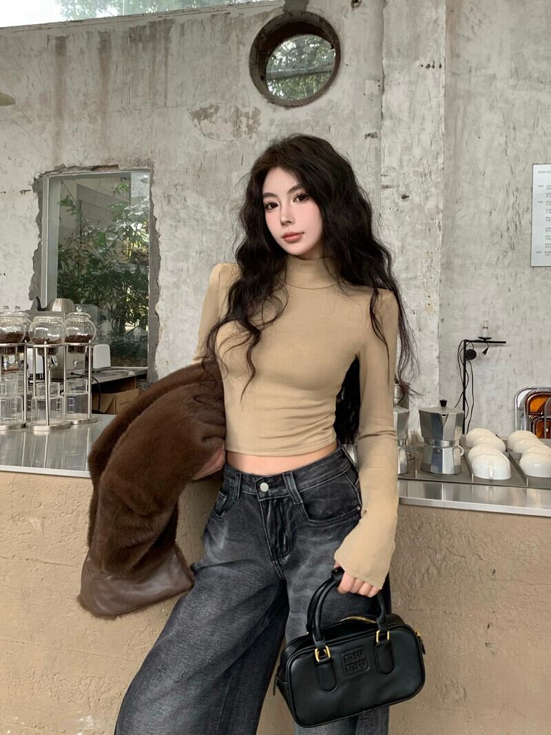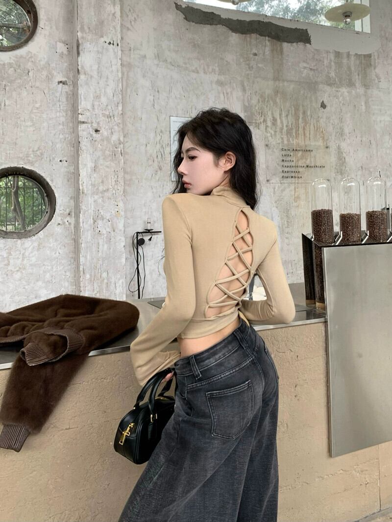 秋と冬の背中の開いた肩パッド入りショートトップ女性、起毛インナーボトムシャツ、セクシーなハーフタートルネック長袖Tシャツ ロング オータム 秋物 ウィンター 冬物 8571620800933679