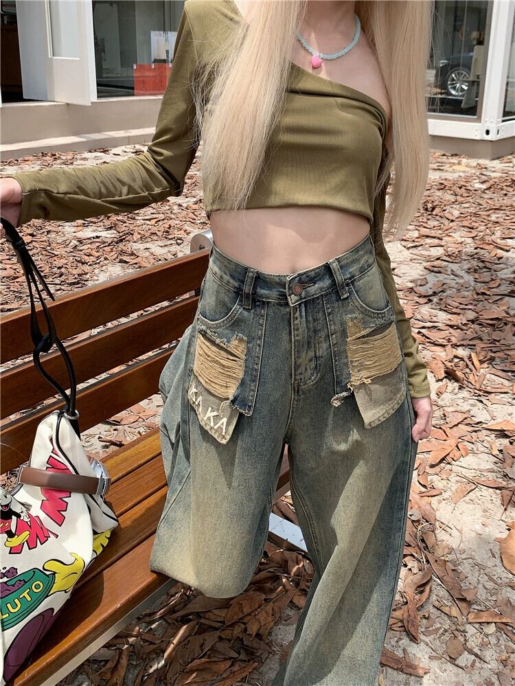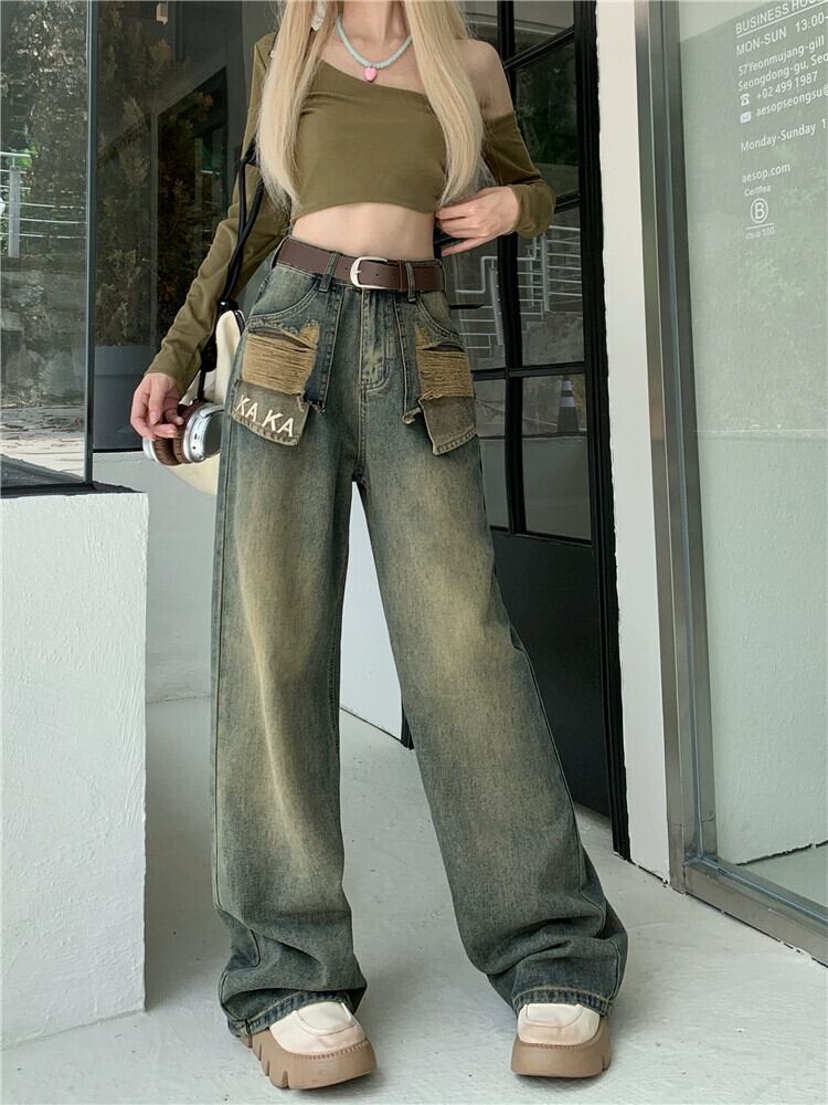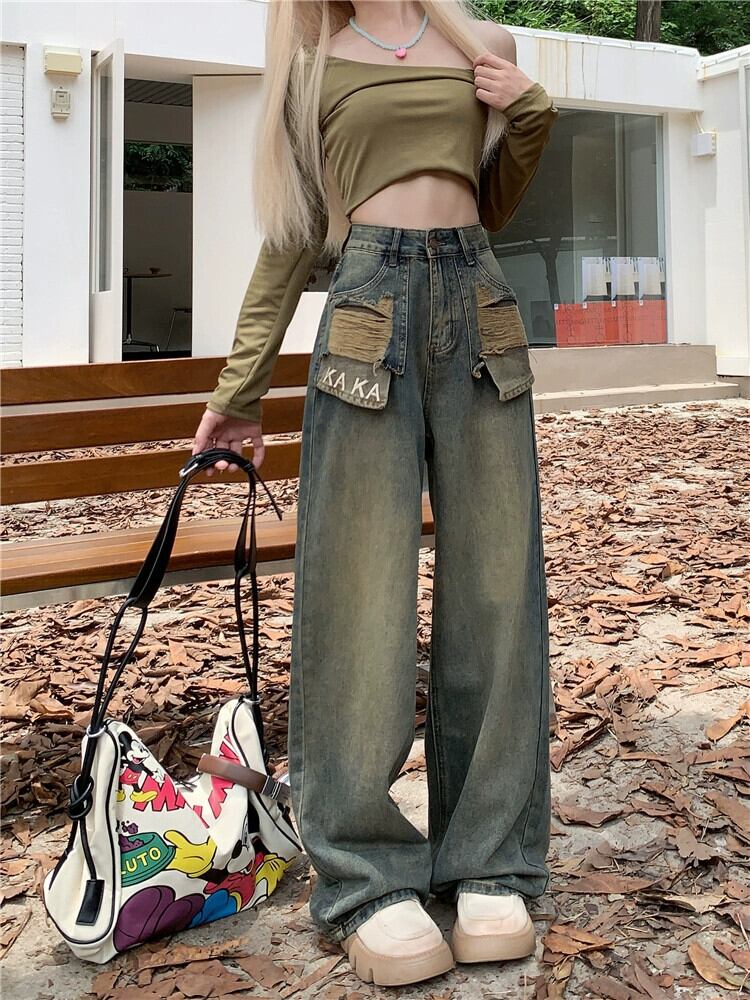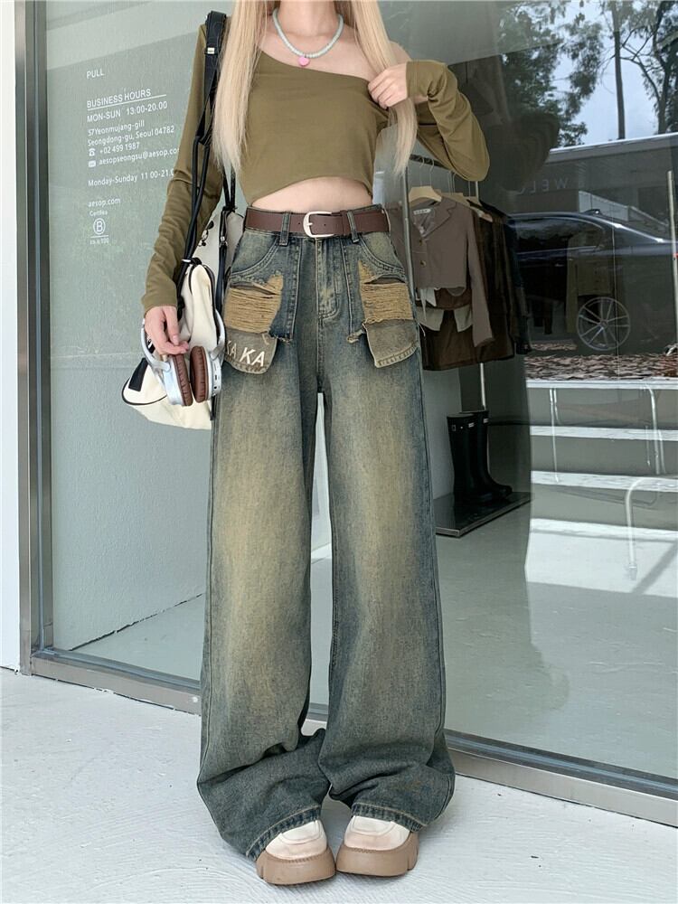 リップドジーンズレディース秋冬デザインハイウエストワイドレッグパンツアメリカンレトロハイストリートストレートフロアレングスパンツ オータム 秋物 ウィンター 冬物 8571654023606503