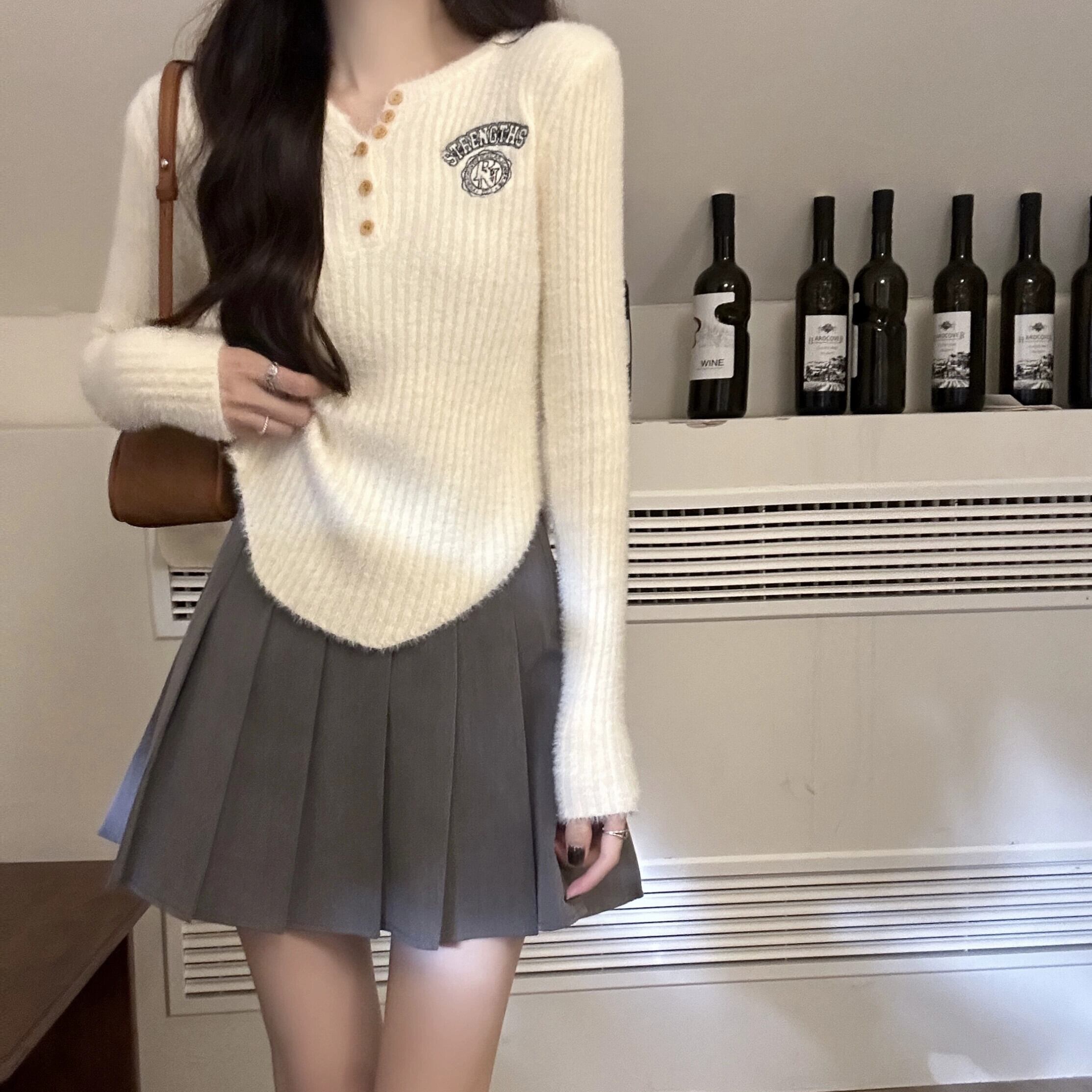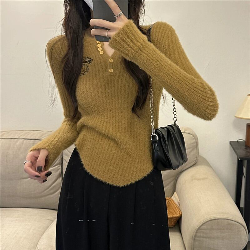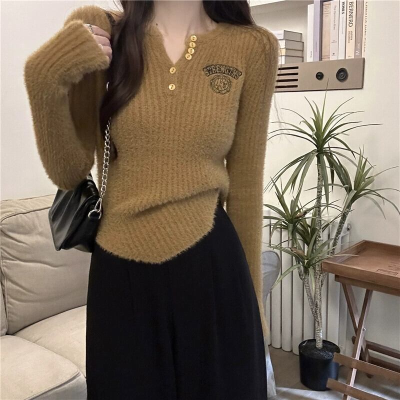 アプリコットニットボトシャツ女性秋と冬模造ミンクベルベット刺繍セーター 2024 新しいスリムフィットインナークロップトップ レッド オータム 秋物 ウィンター 冬物 8571657296666172