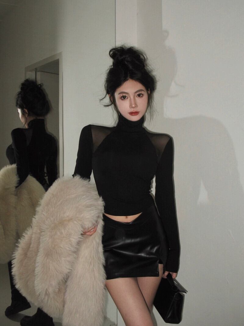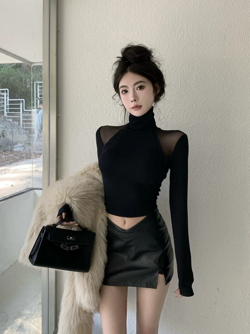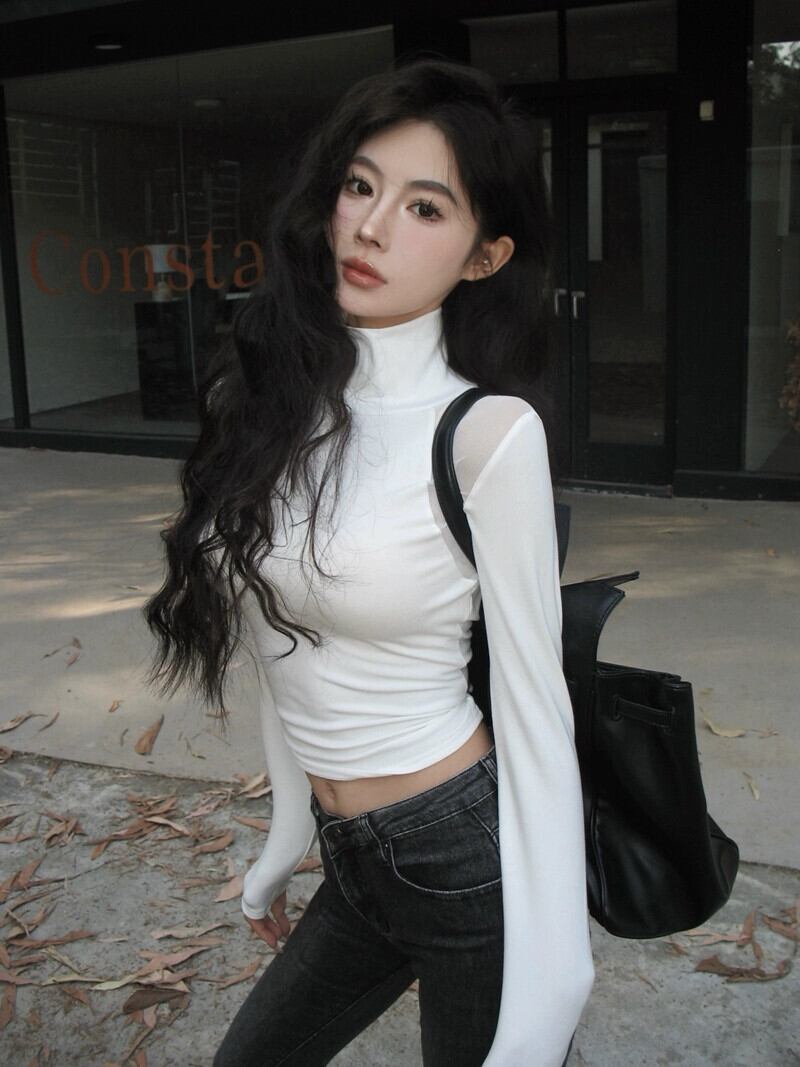 襟インナーボトリングシャツ女性秋と冬のプラスベルベット黒長袖 T シャツセクシーで慎重なショートトップ ロング ブラック オータム 秋物 ウィンター 冬物 Tシャツ 8571613570714337
