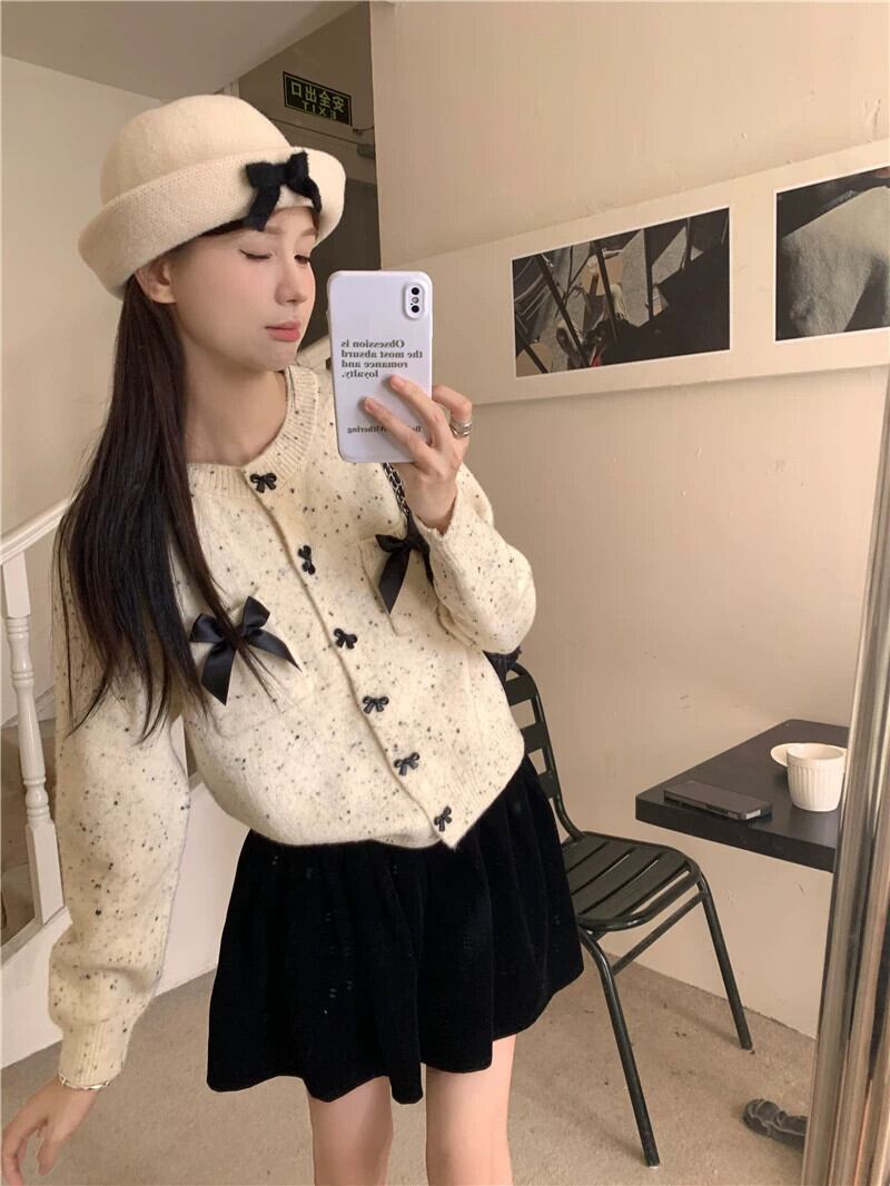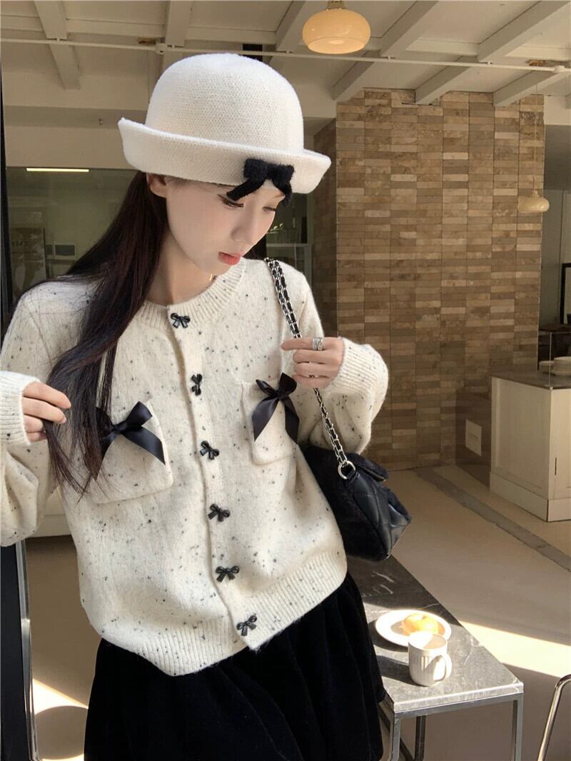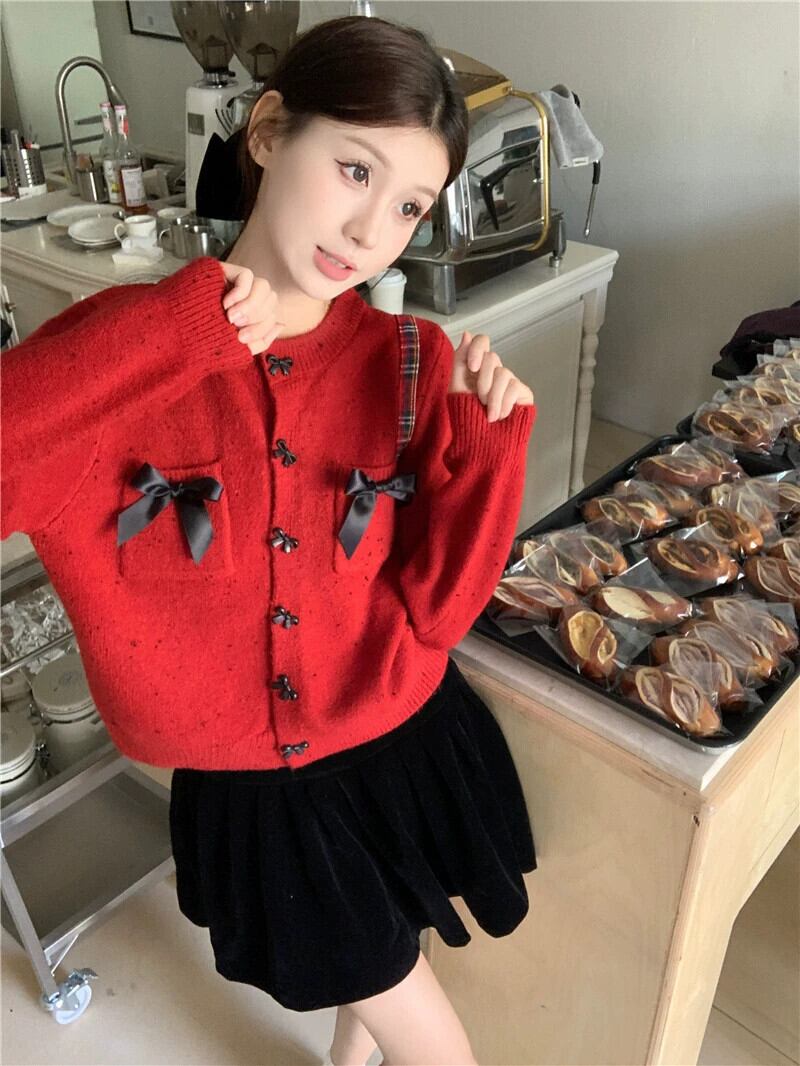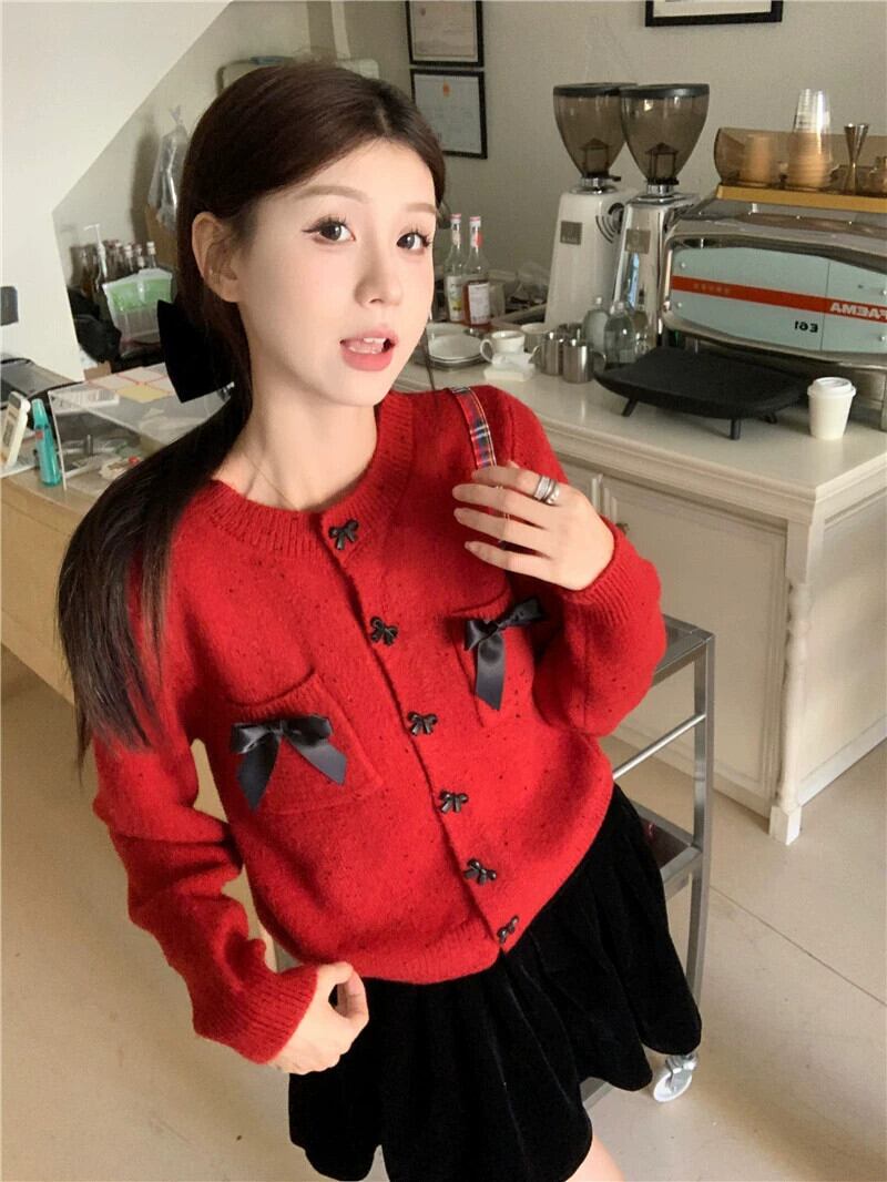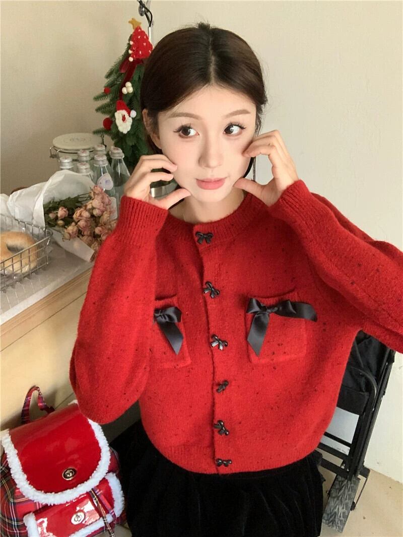 年レッドリボンセータージャケット女性の秋と冬のクリスマスウェアエンドスモールフレグランススタイルショートニットカーディガン オータム 秋物 ウィンター 冬物 8571653434168299