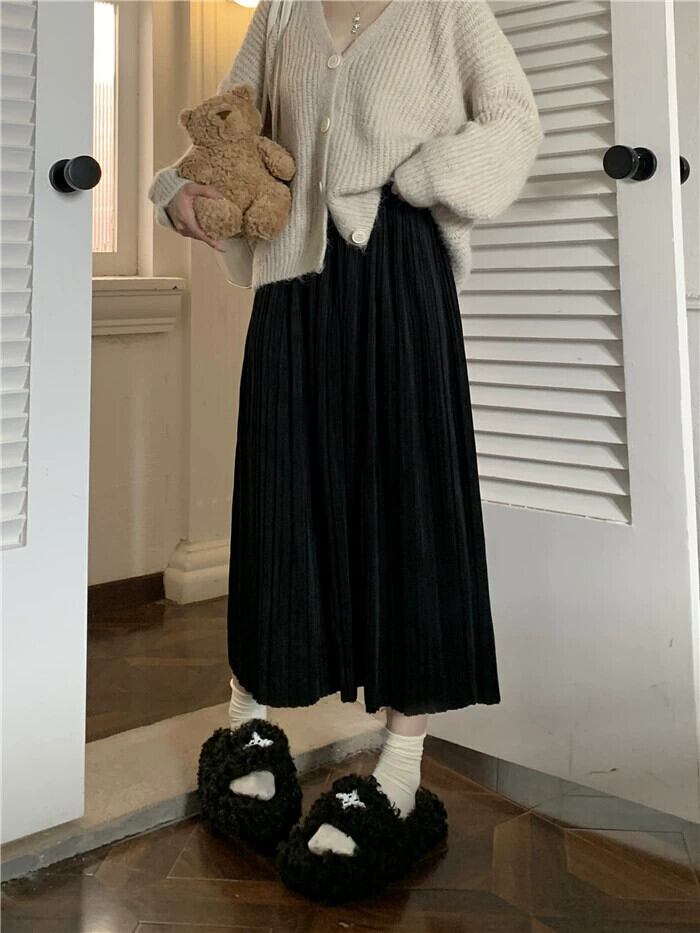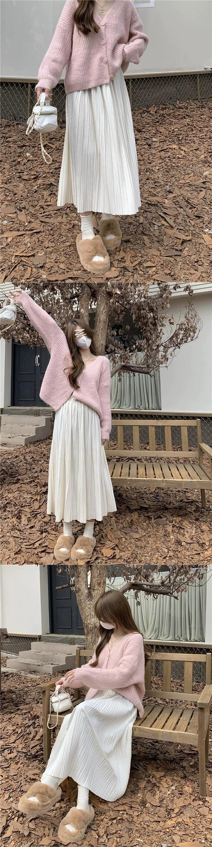 色:アプリコットスカート,黒スカート,ピンクのセーター,ミルクティーセーター