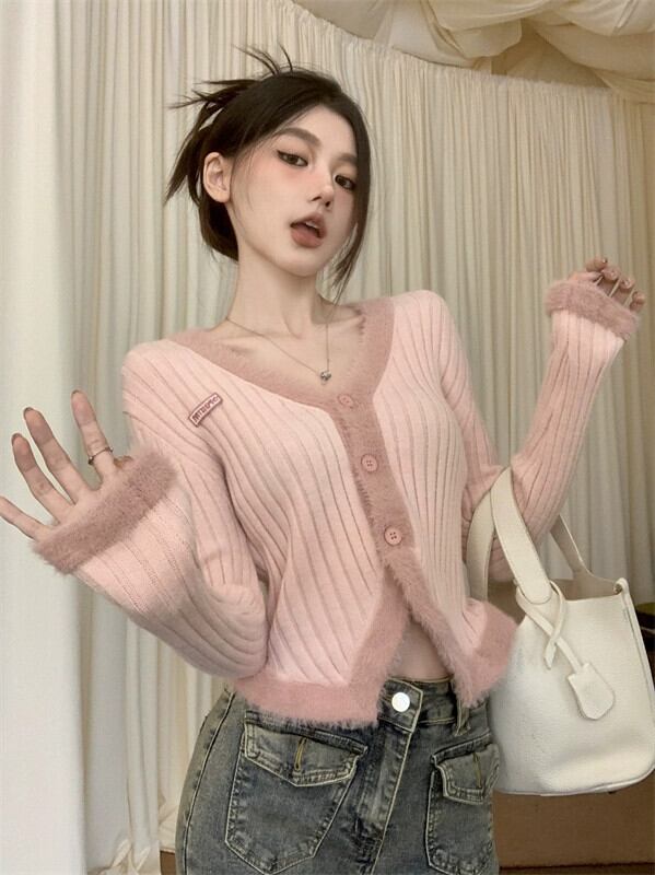ピンクのセータージャケットの女性の秋冬 2024 新しい甘くてシックな超見栄えの良いトップ V ネックショートニットカーディガン 大人ガーリー スウィート キュート カジュアル オータム 秋物 ウィンター 冬物 Vネック 8571663666472347