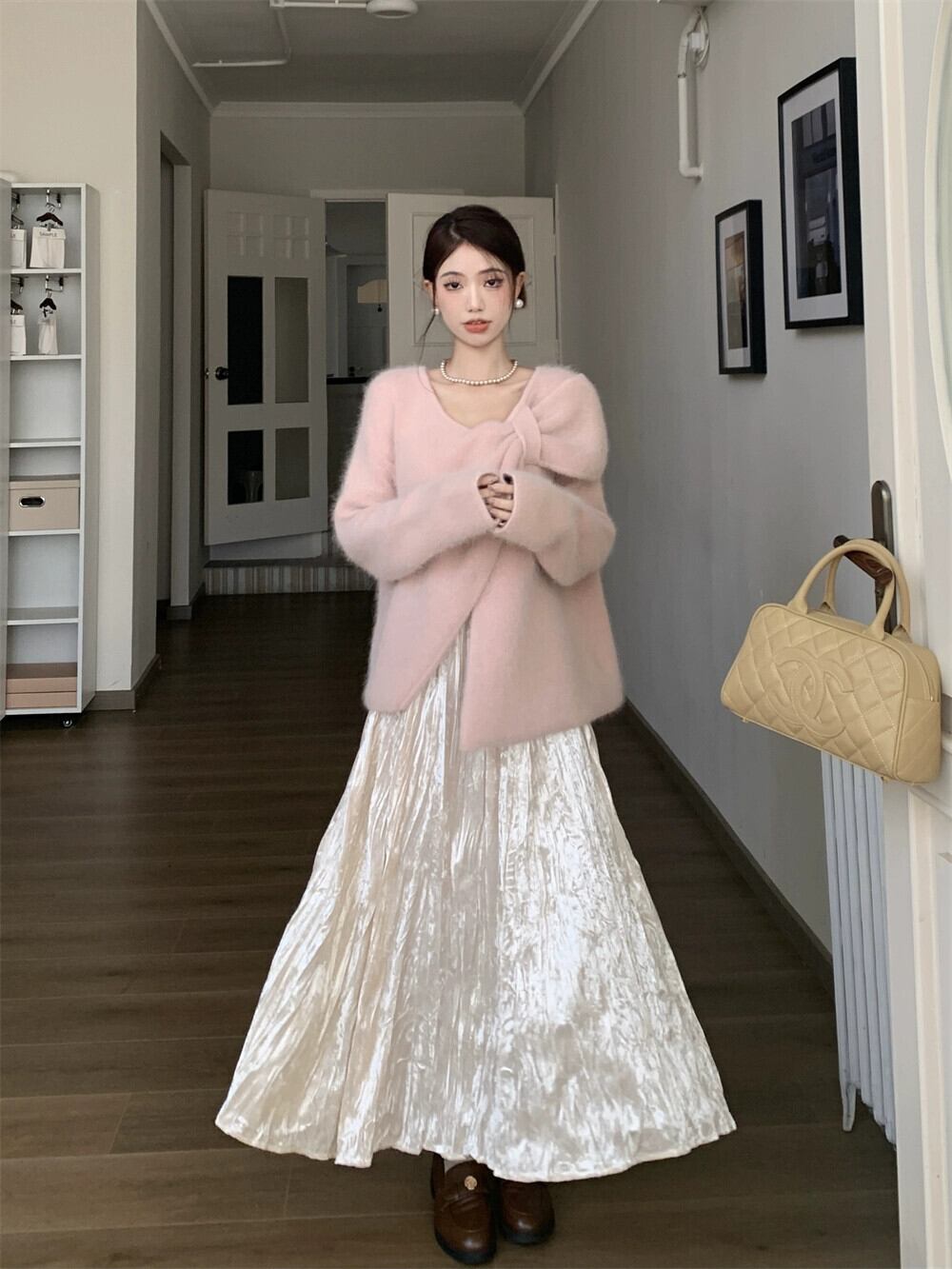 ピンクのリボンセーターの女性、2024年秋冬の新しいスタイル、怠惰なスタイル、とても素敵な不規則なニットセーター オータム 秋物 ウィンター 冬物 8571632802772983