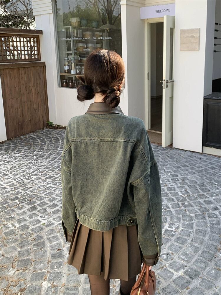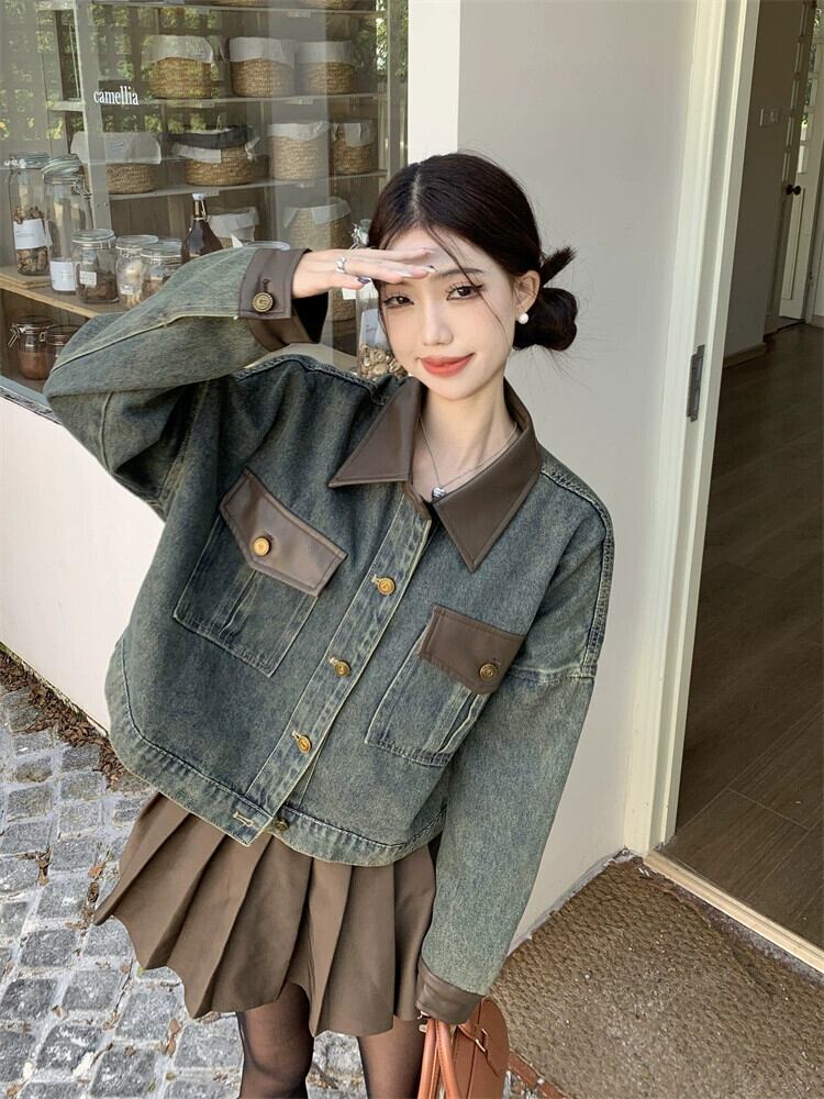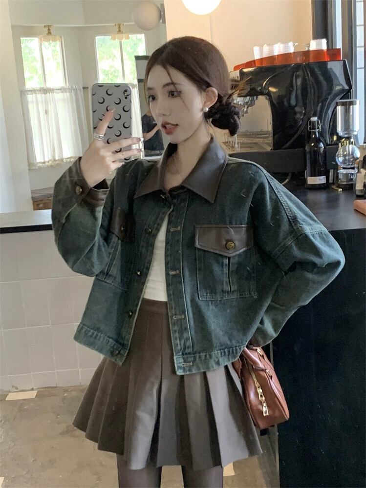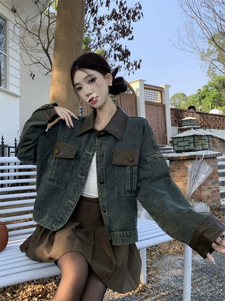 Pu レザースプライシングデニムジャケットの女性の秋と冬 2024 新しいアメリカンレトロハイストリートニッチデザインジャケットトップ オータム 秋物 ウィンター 冬物 8571690456071972