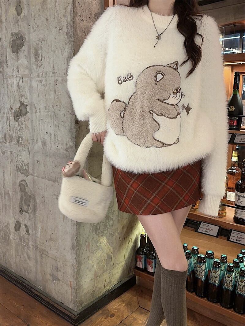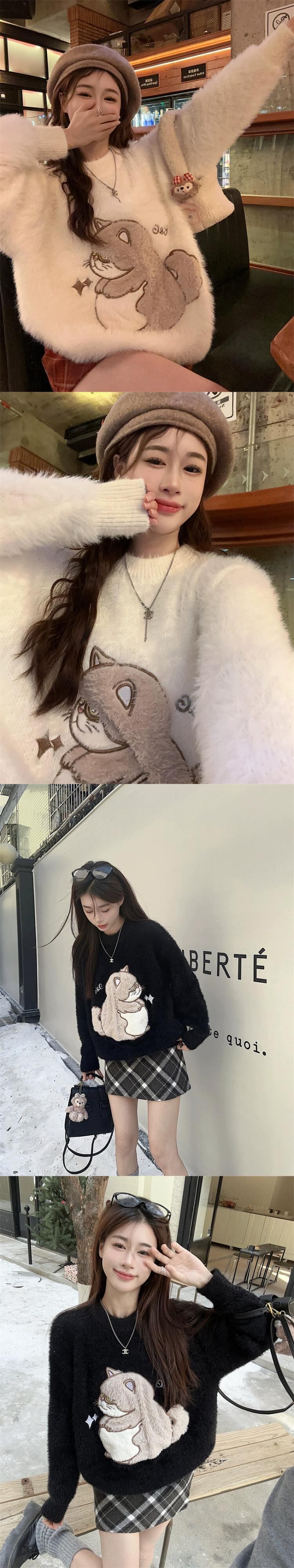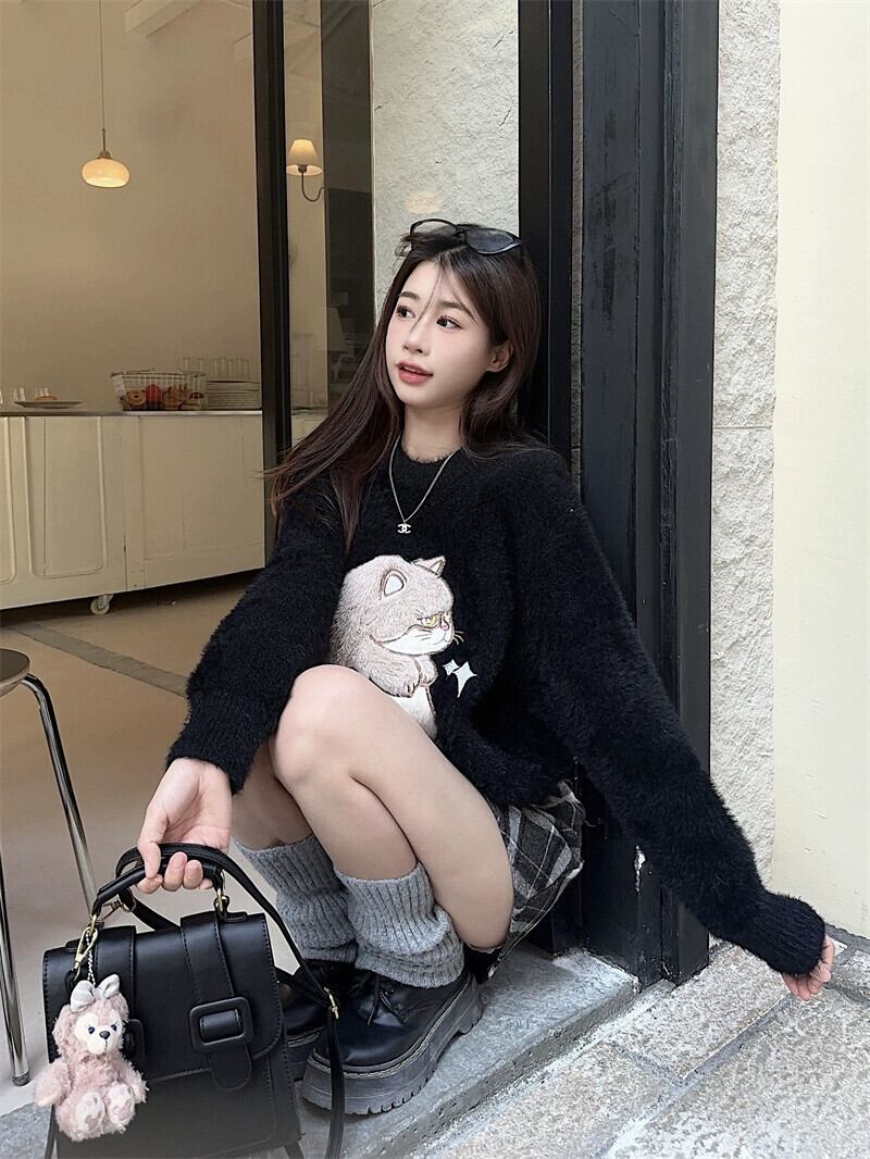 黒ラウンドネックセーター女性秋と冬 2024 新しいスタイルふふ怠惰なスタイルソフトとワックスのようなかわいいニットセーター ブラック 大人ガーリー スウィート キュート カジュアル オータム 秋物 ウィンター 冬物 Oネック 8571635873271336