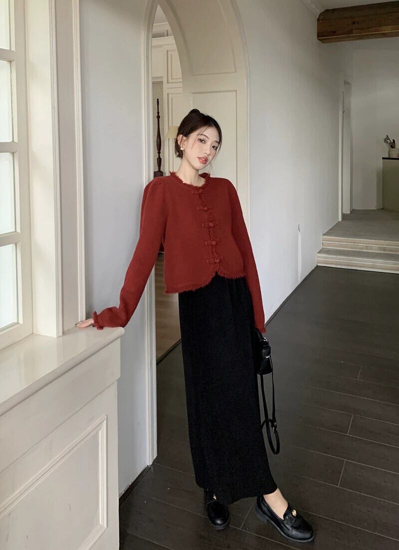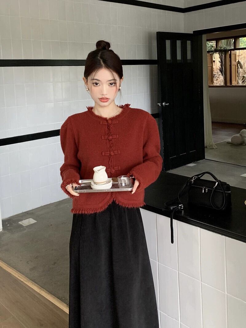 中国風のボタン付きセータージャケット女性秋冬クリスマス年レッドテルショートニットカーディガン オータム 秋物 ウィンター 冬物 857168908087309