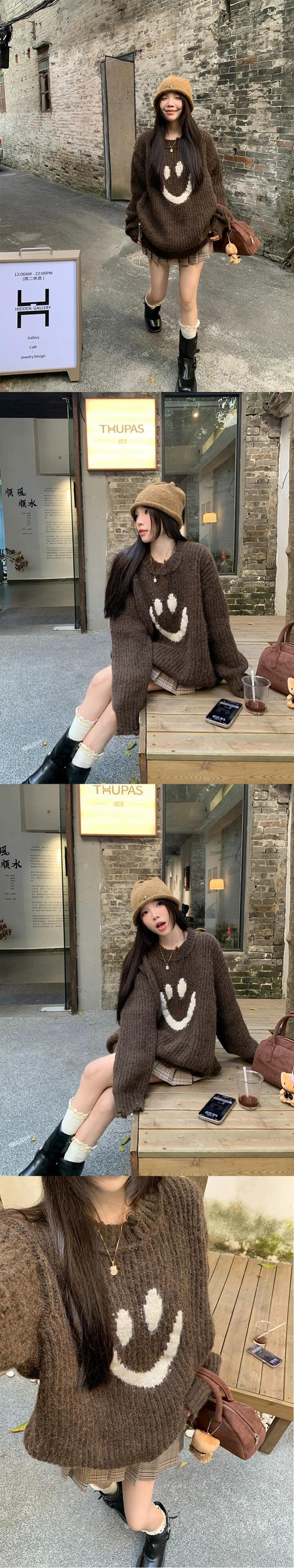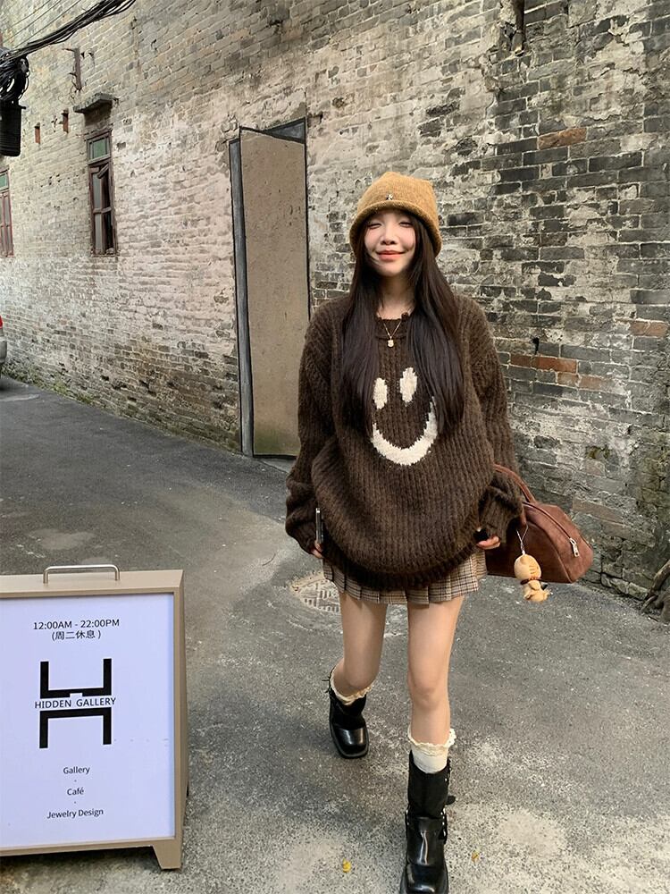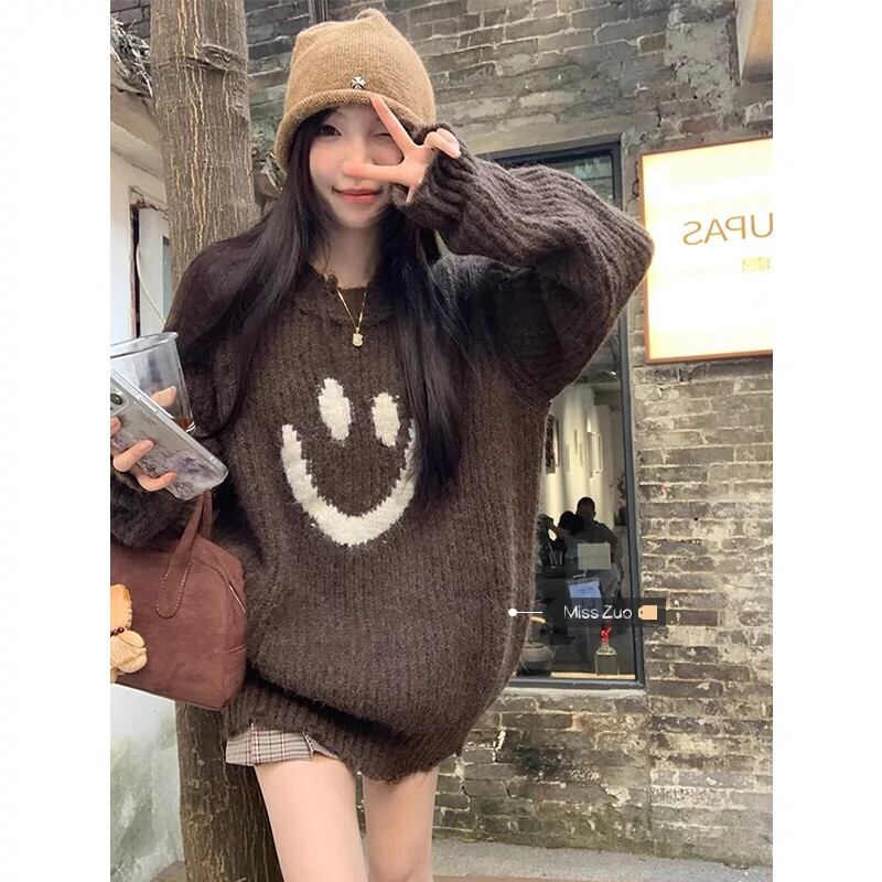 メイラードコーヒーカラースマイリーフェイスセーター女性の秋と冬 2024 レトロルーズレイジー風穴あきニットトップ オータム 秋物 ウィンター 冬物 8571612036079184