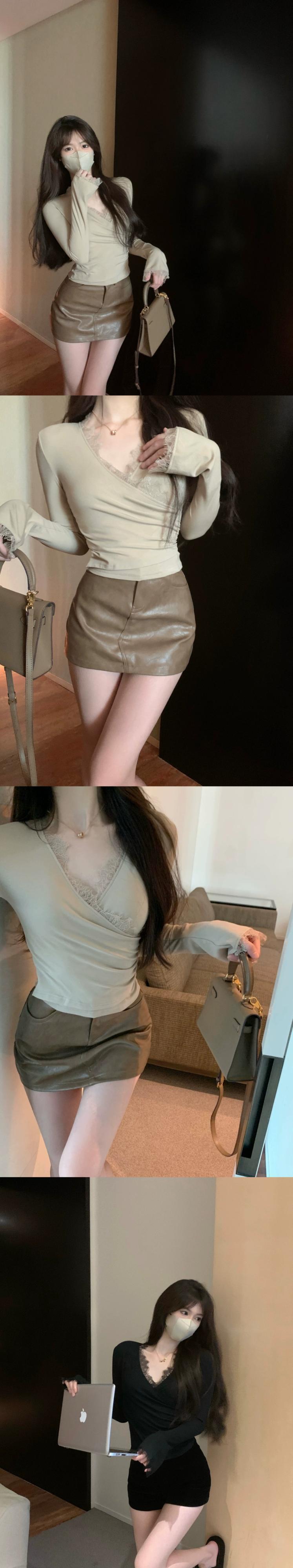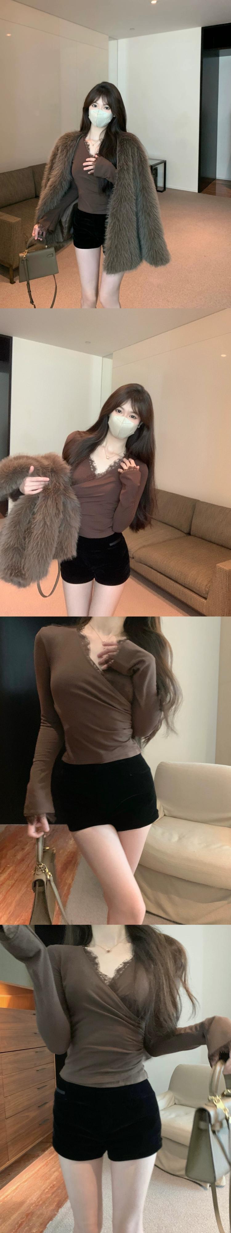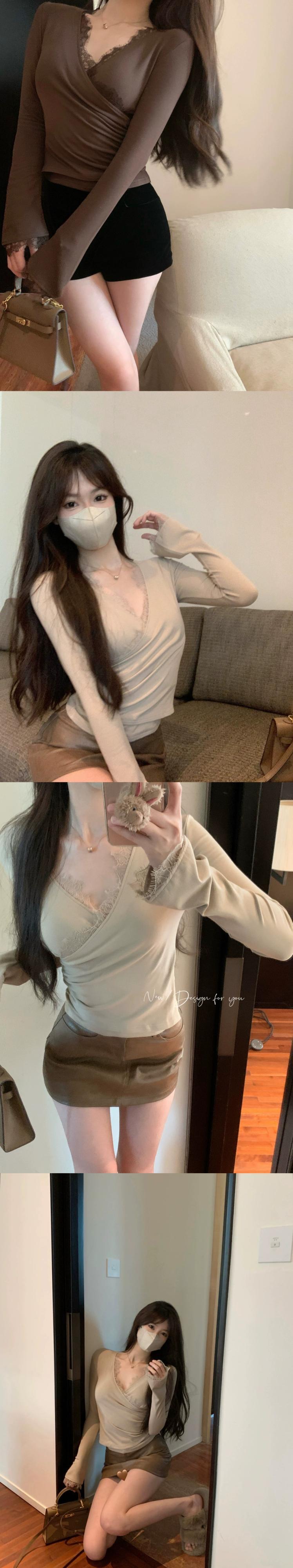 レーススプライシング V ネックショートトップ女性の秋と冬のインナーレイヤリングシャツ純粋な欲望ファッショナブルな長袖 T シャツ ロング オータム 秋物 ウィンター 冬物 Vネック Tシャツ ピュア 8571634513738508
