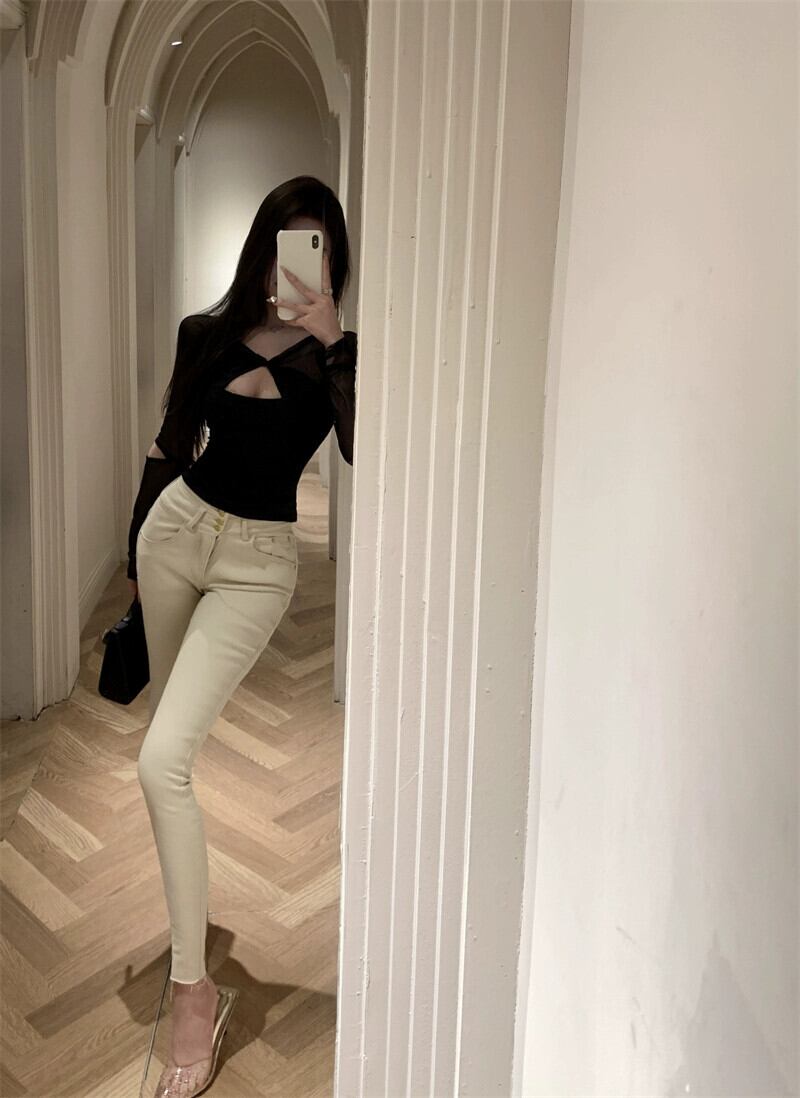 メッシュ中空ショートトップ女性の秋と冬ボトリングトップ純粋な欲望ホットガールセクシーなスリム黒長袖 Tシャツ ロング ブラック オータム 秋物 ウィンター 冬物 ピュア 8571686522725136