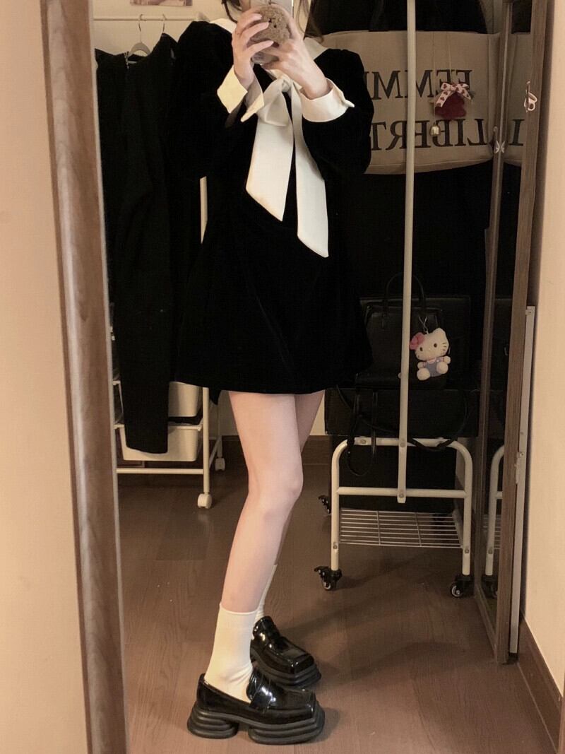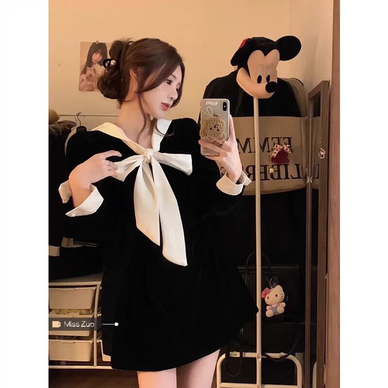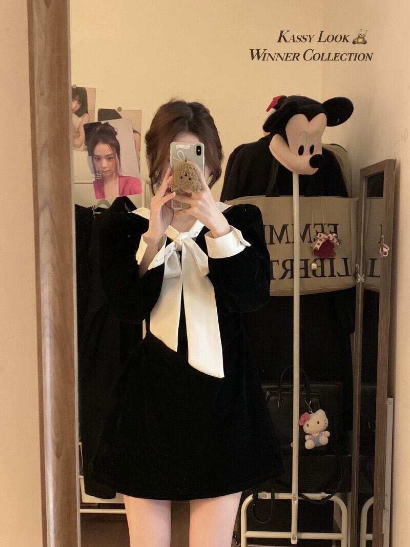 ブラックゴールドベルベットのドレスの女性の秋と冬 2024 新しいフランスの穏やかな気質の弓ショートスカート リボン オータム 秋物 ウィンター 冬物 8571636820860414