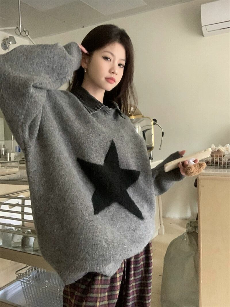 コントラストカラースターセーター女性の秋冬 2024 新しいレトロな怠惰なスタイルのハイエンドルーズポロカラーセーター オータム 秋物 ウィンター 冬物 8571648654674165
