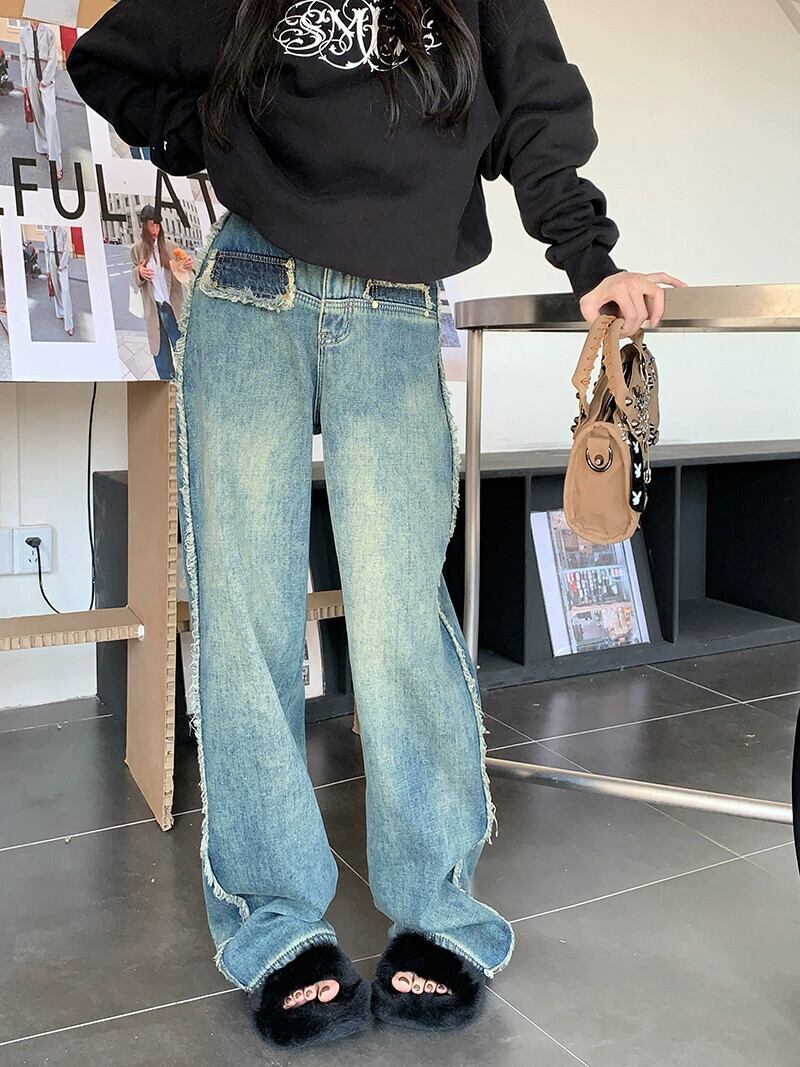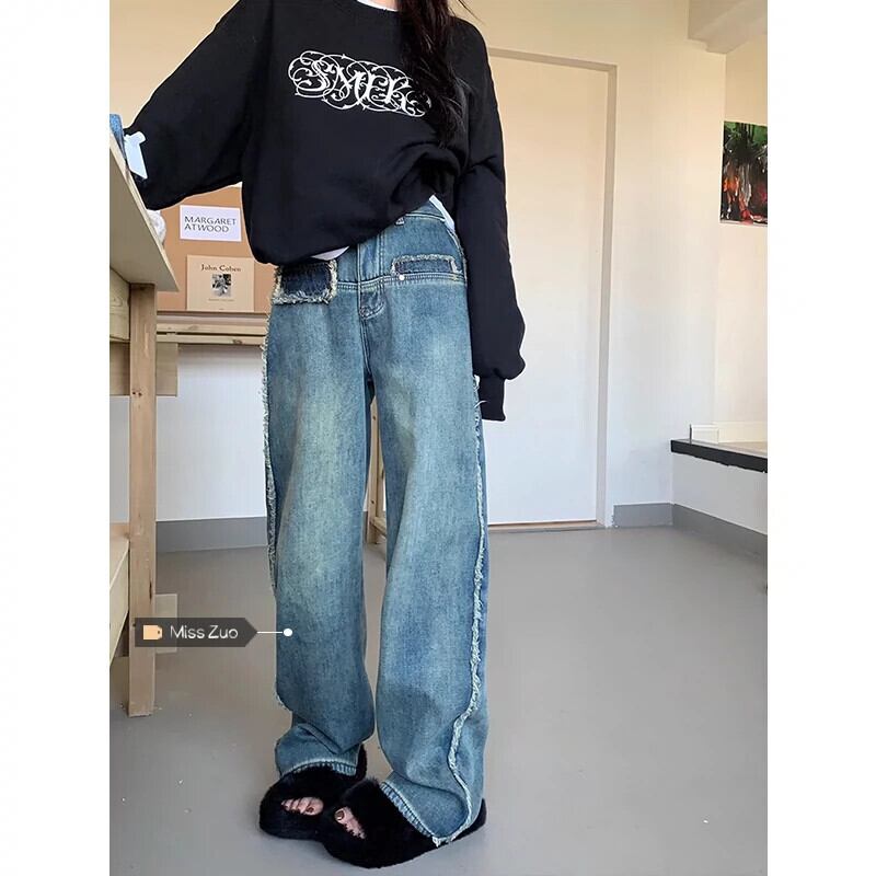 レトロ生エッジプラスベルベット肥厚ジーンズ女性秋と冬 2024 新しいハイウエスト痩身ワイドレッグストレートフロアモップパンツ ハイウェスト オータム 秋物 ウィンター 冬物 ワイドパンツ 8571638330712248