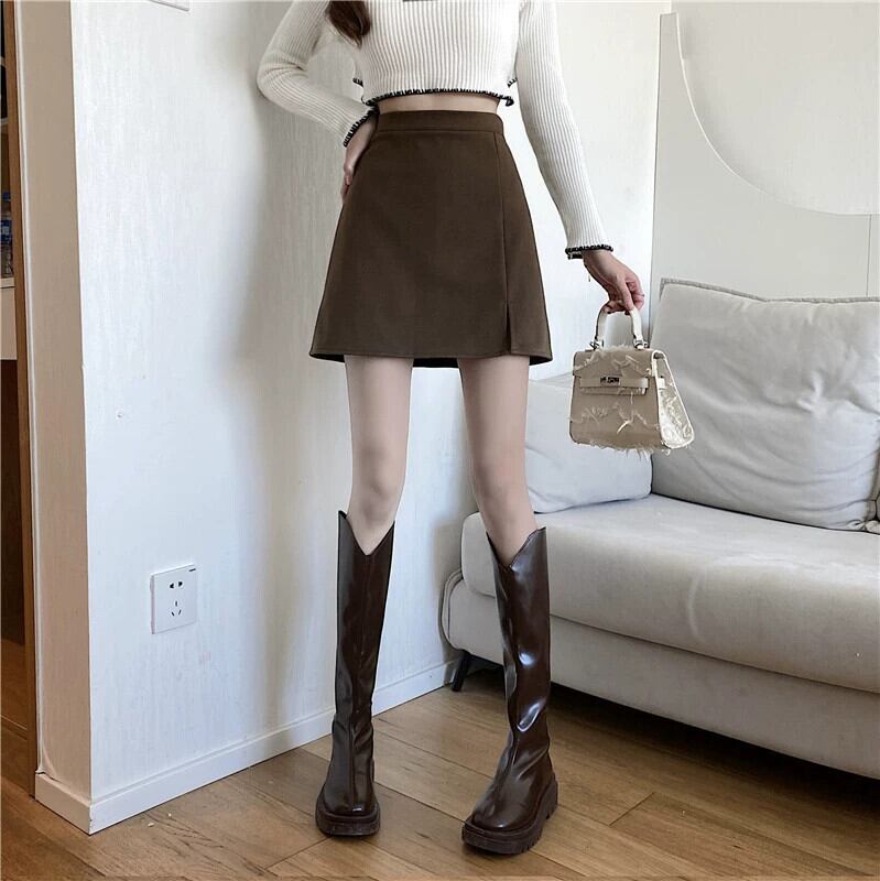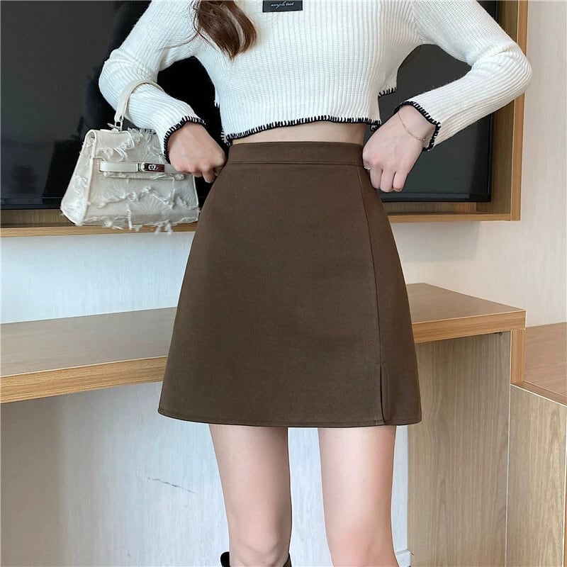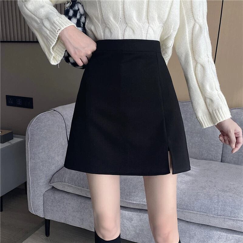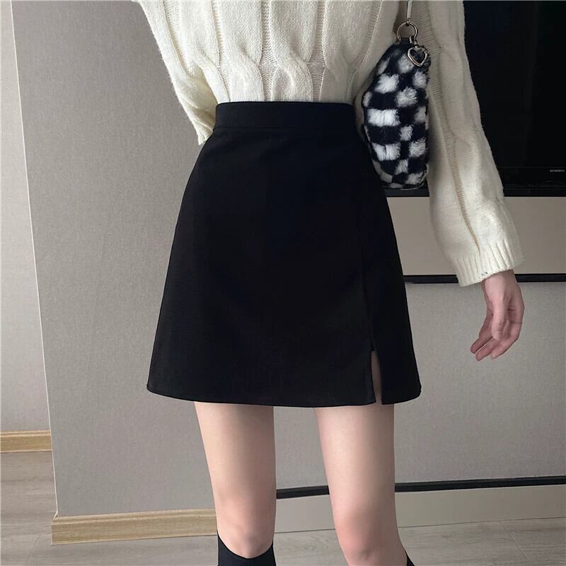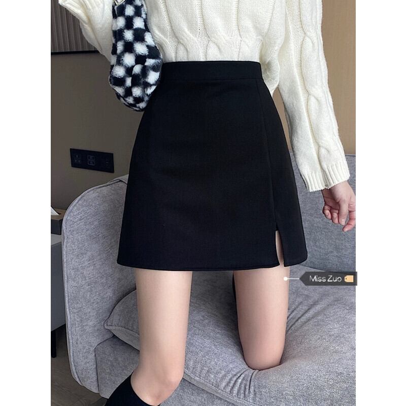 秋冬の黒のウールのショートスカートの女性、サイドスリット、ハイウエスト、厚くてスリムなAラインヒップスカート、小柄な人 ハイウェスト ブラック オータム 秋物 ウィンター 冬物 8571653265213297