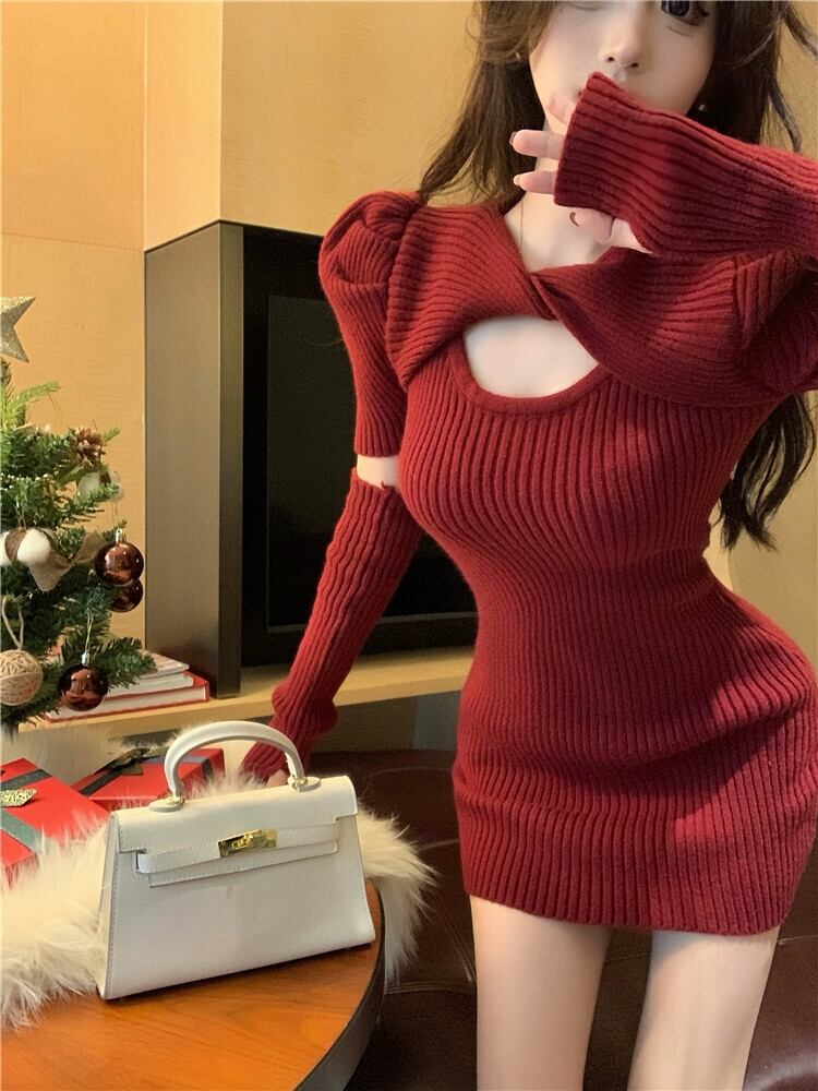 赤いニットドレスの女性、秋と冬のクリスマスウェア、純粋な欲望、パフスリーブ、インナーレイヤー、セーター、ヒップスカート レッド オータム 秋物 ウィンター 冬物 ピュア 8571692598594630