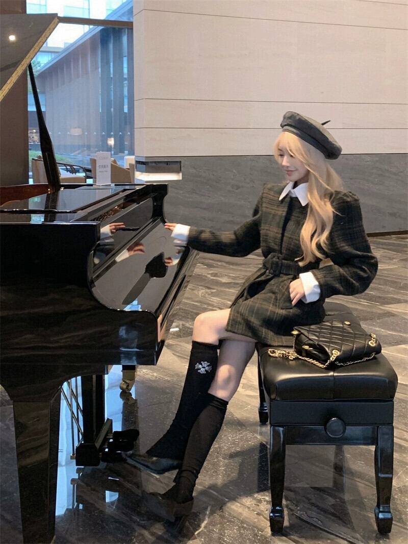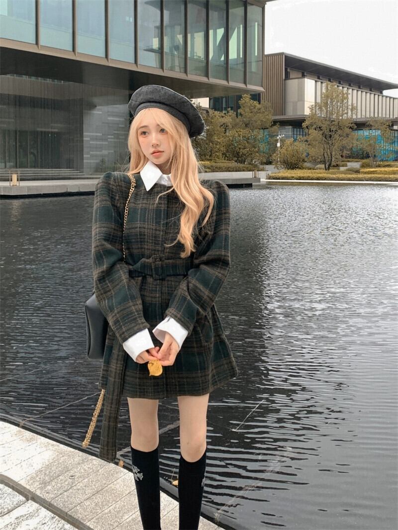 レトロチェック柄フェイクツーピースウールコート女性の冬 2024 新しいスタイルウエストレングスミッドレングスウールコート ウィンター 冬物 8571615570420171