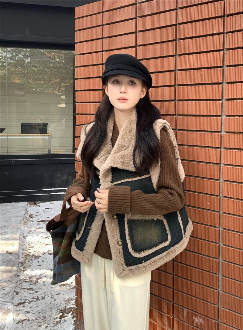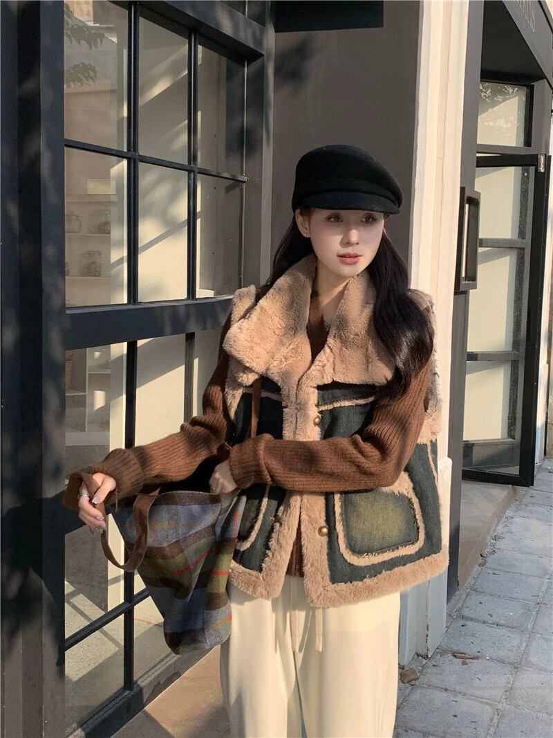 Xiaoxiangfeng ミンクヘア デニム ベスト ジャケット レディース 2024 冬 - 暖かいスタンドカラー トップ ウィンター 冬物 8571691640501761