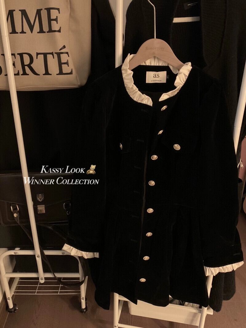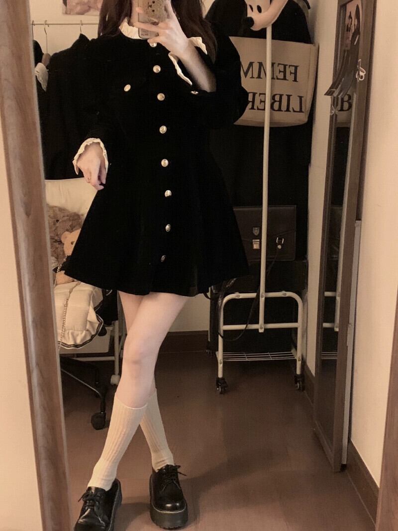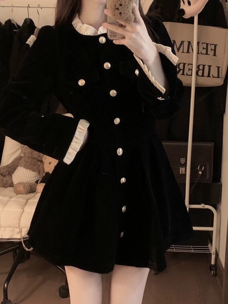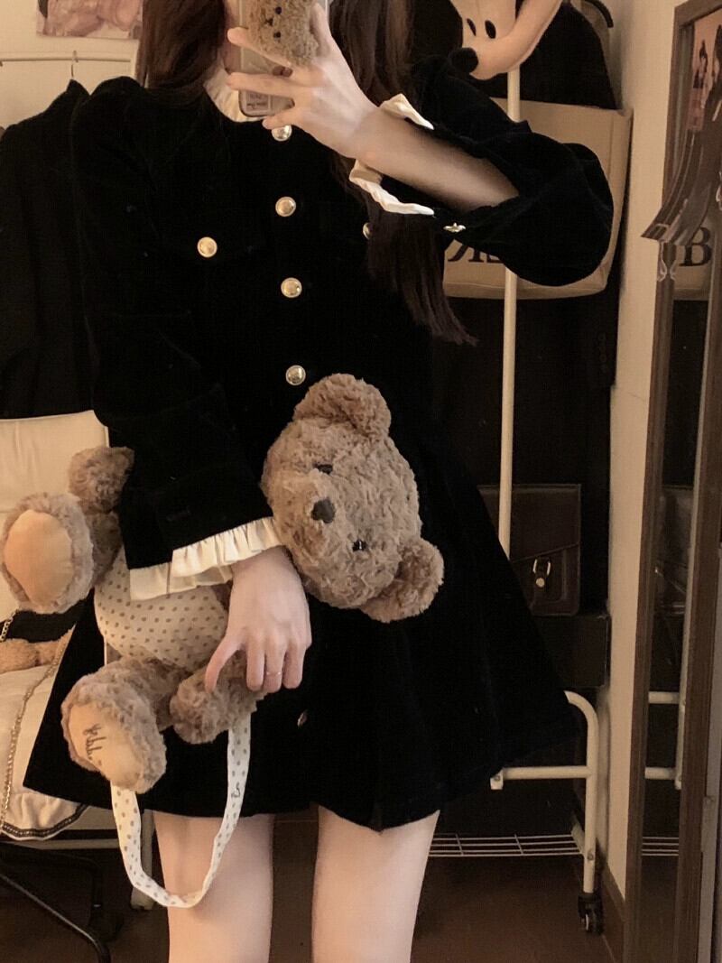 アメリカンブラックレトロネクタイドレス女性冬のレース小柄なブレストニッチデザインショートスカート ウィンター 冬物 857166082649141