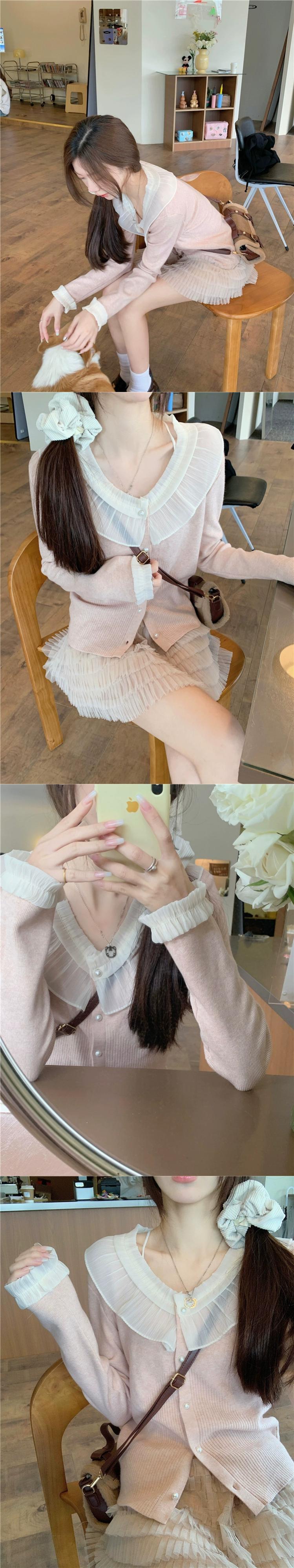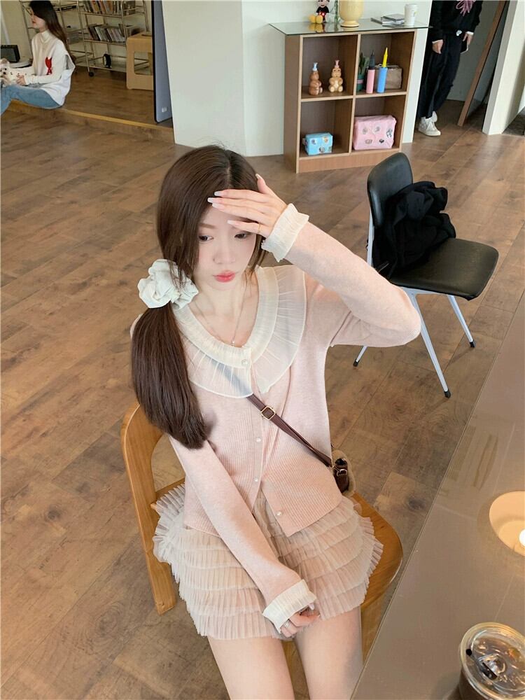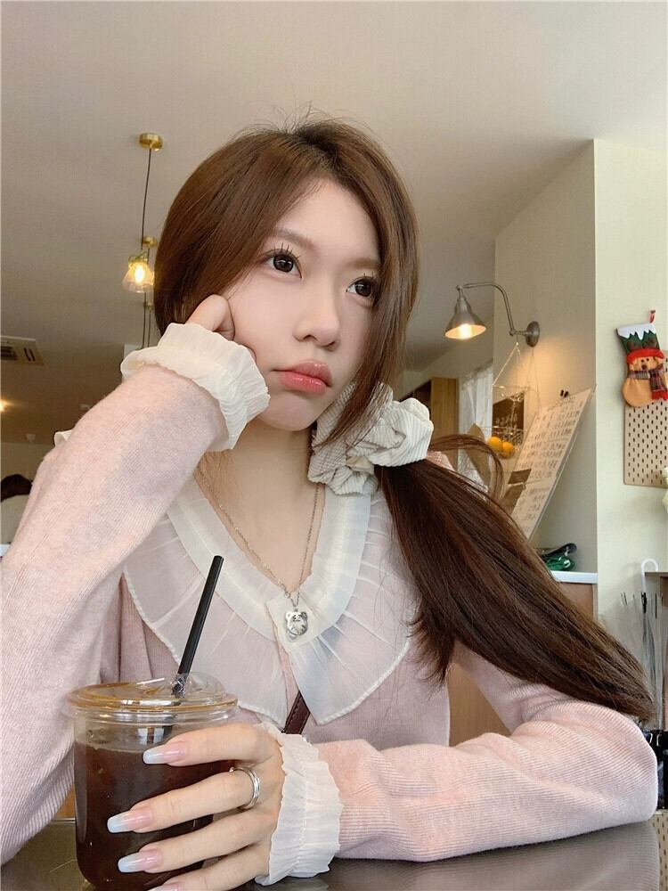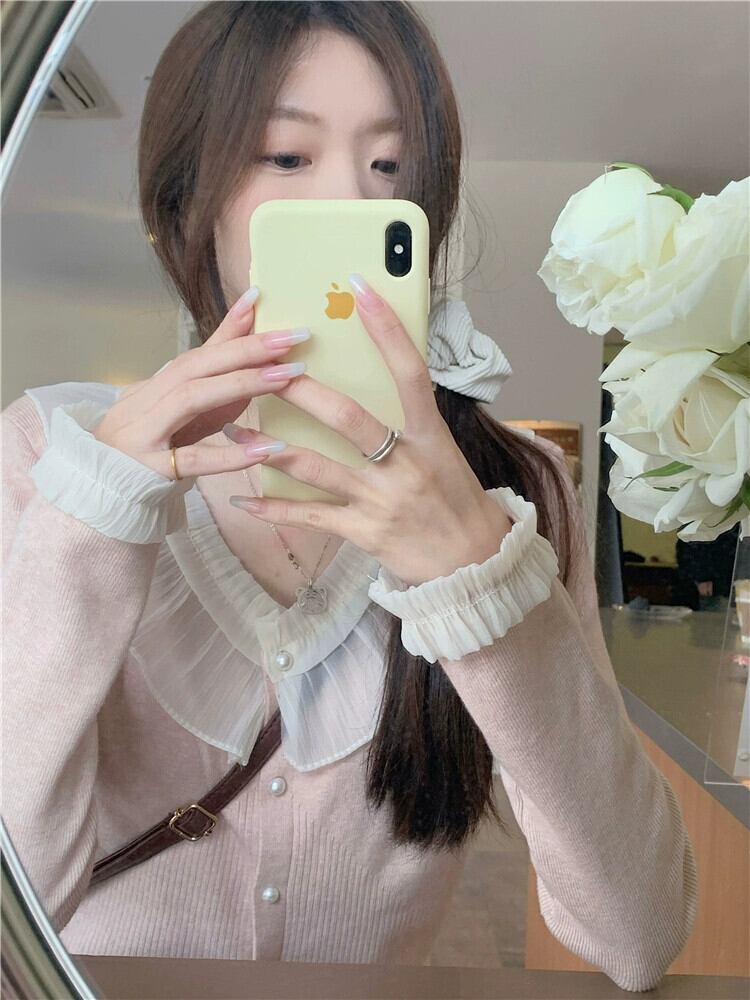 フリルスプライシング長袖セーターの女性の冬 2024 新しいスタイルのパールボタン V ネックセーターシックな年齢軽減トップ ロング ウィンター 冬物 Vネック 真珠 8571649667036479