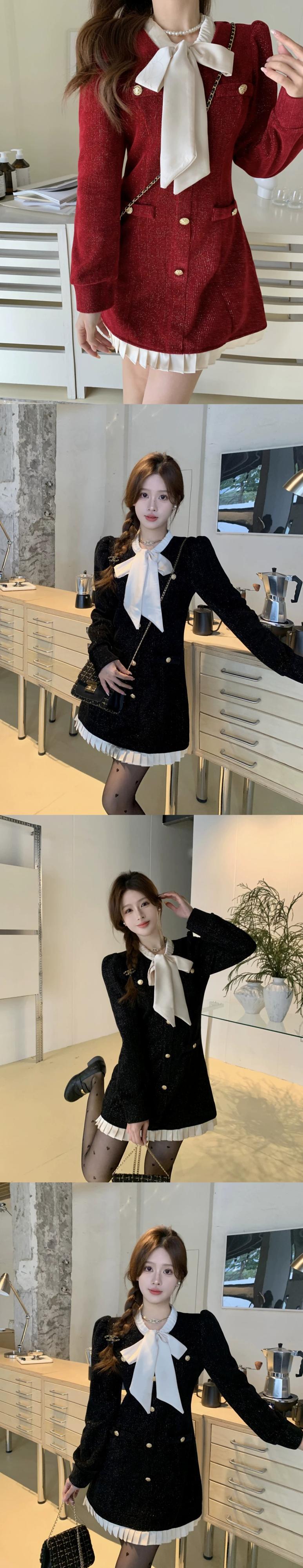 赤いドレスの女性の秋冬 2024 スタイル美しい気質ウエスト人形襟ショートスカートコントラストカラークリスマススカート レッド オータム 秋物 ウィンター 冬物 8571616750255244