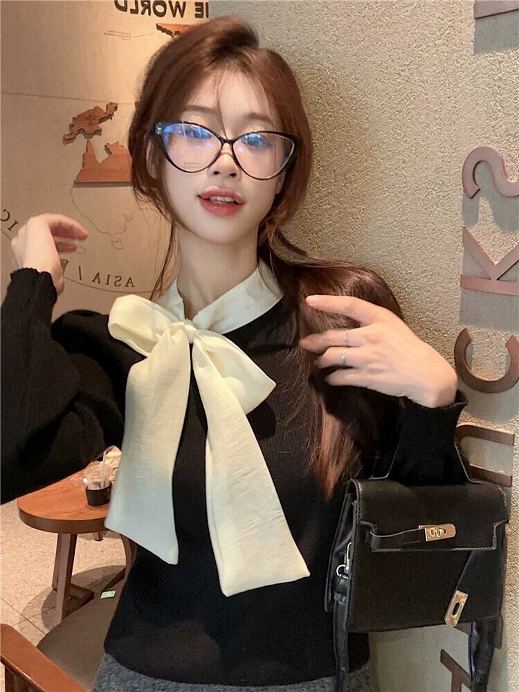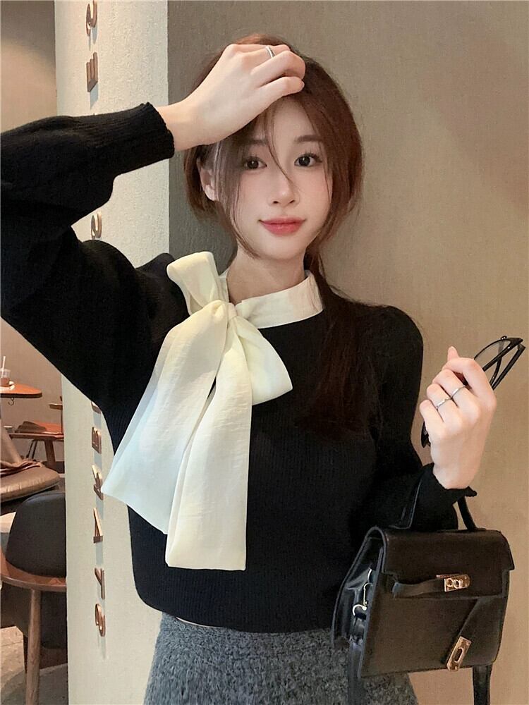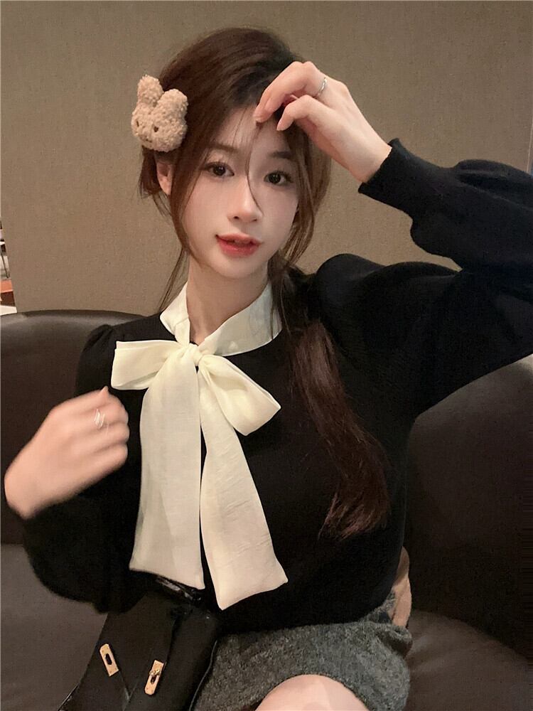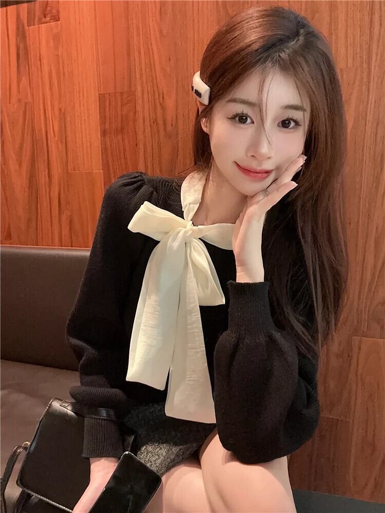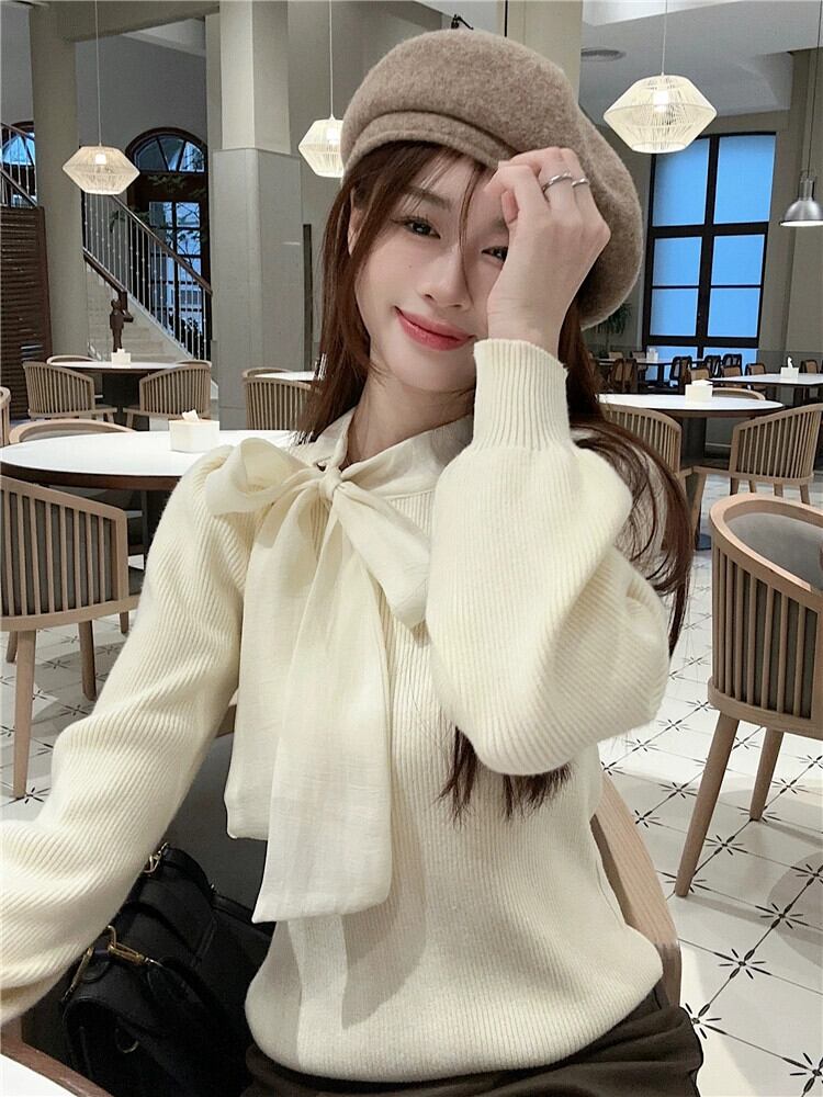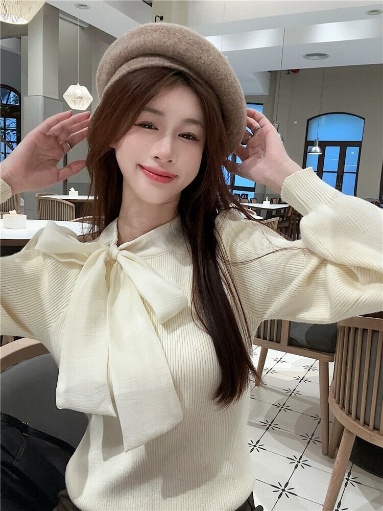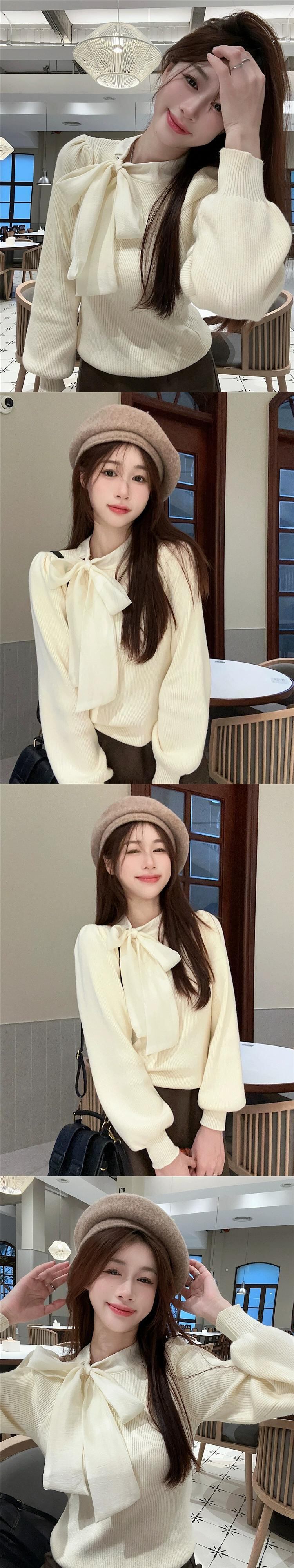 リボン ニット セーター レディース 2024 秋冬 - 気質パフ スリーブ トップ ボトリング セーター オータム 秋物 ウィンター 冬物 8571683639607295