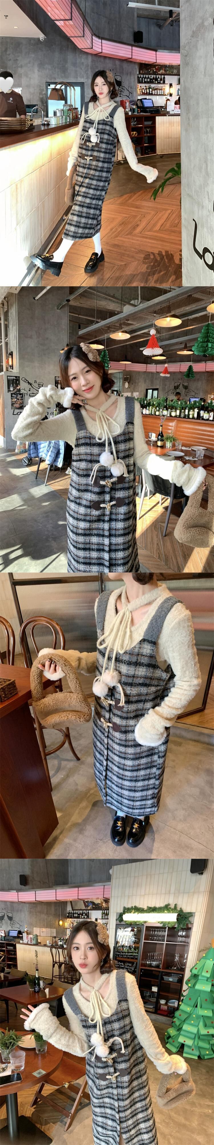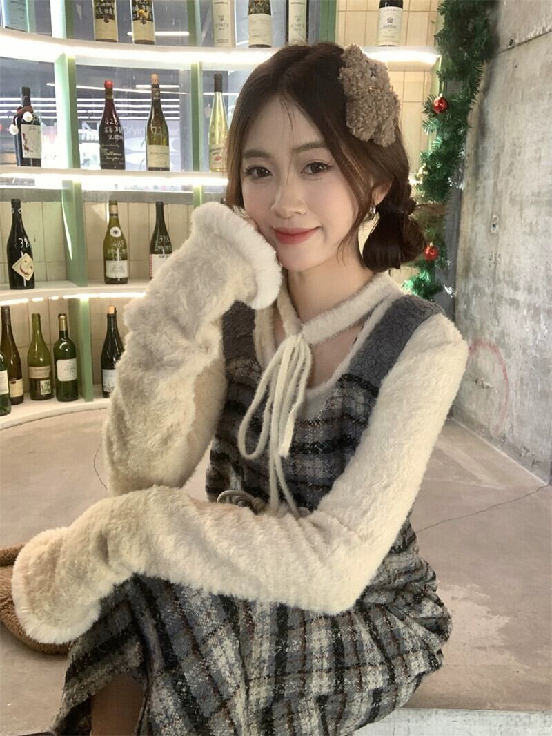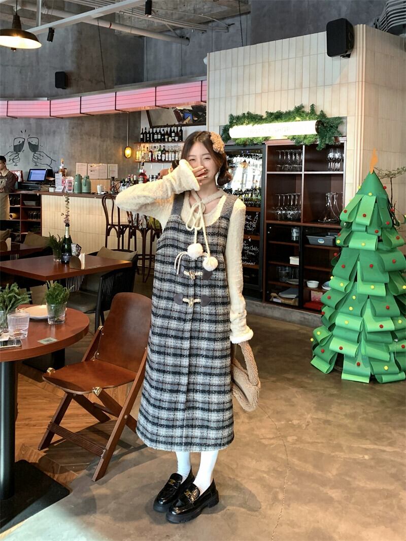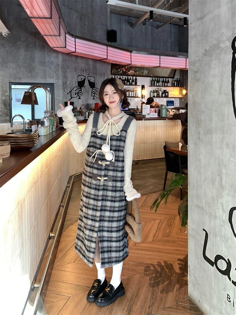 チェック柄サスペンダードレス女性の秋と冬のレトロな気質ウエストホーンバックルスリットサスペンダースカートスーツ オータム 秋物 ウィンター 冬物 8571680165356735