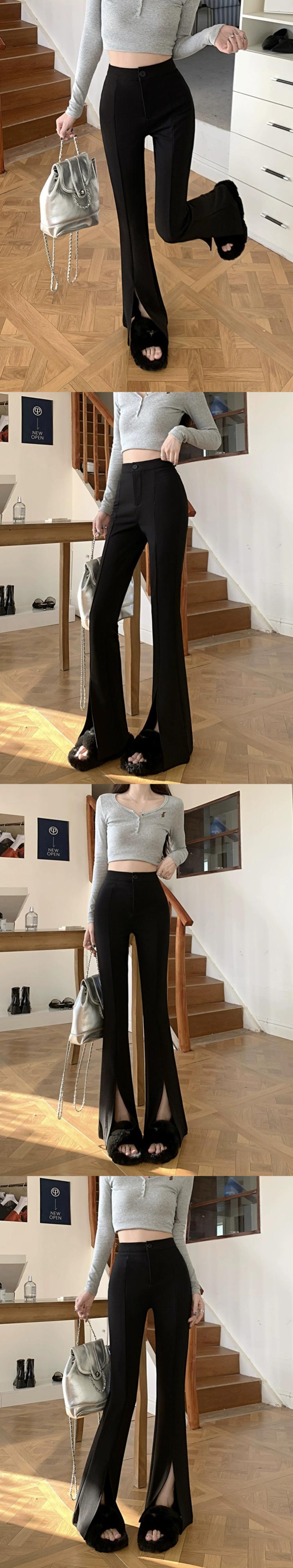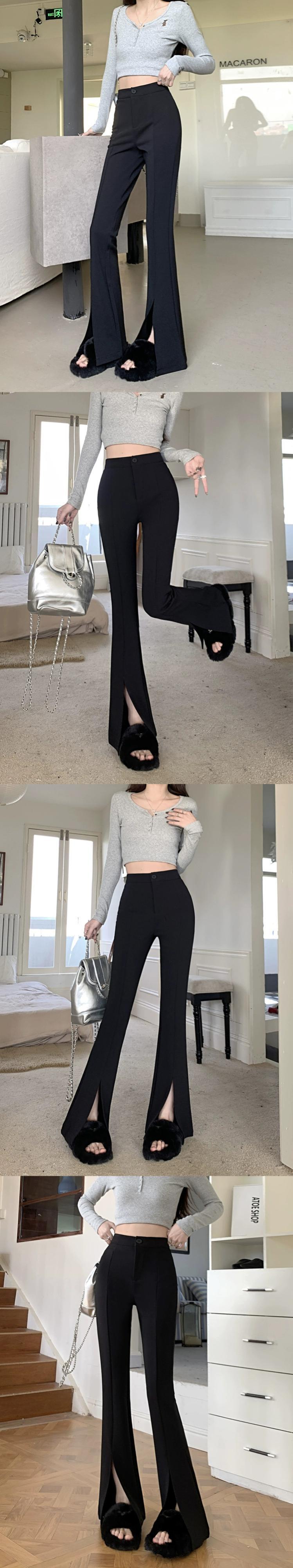 秋冬の黒のフロントスリットパンツレディース、マイクロフレアスーツパンツ、ハイウエストスリムパンツ、ドレープのあるフロアレングスのワイドレッグパンツ レッド ブラック オータム 秋物 ウィンター 冬物 8571673225149276