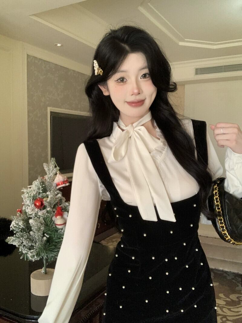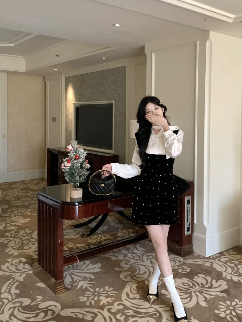 重工業水玉ベルベットサスペンダードレス女性の秋冬 2024 新しいレイヤードスリム A ラインスカートヒップカバーショートスカート レッド オータム 秋物 ウィンター 冬物 Aライン 8571646207912187