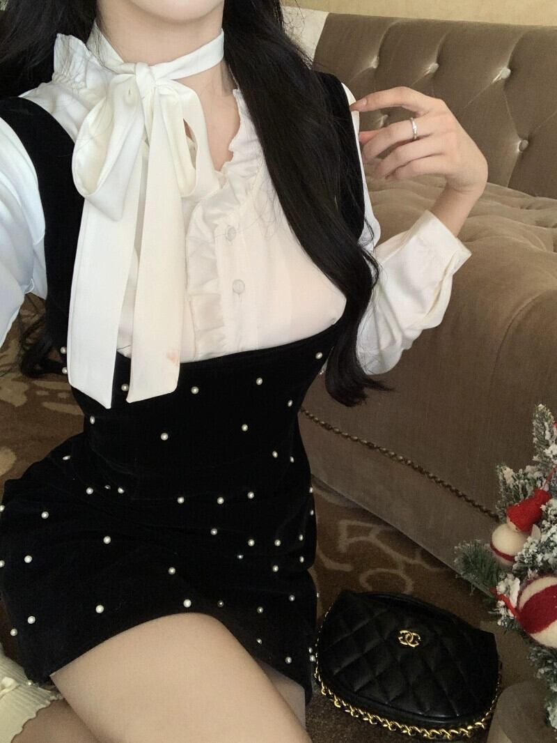 色:オフホワイトのシャツ,ブラックサスペンダースカート