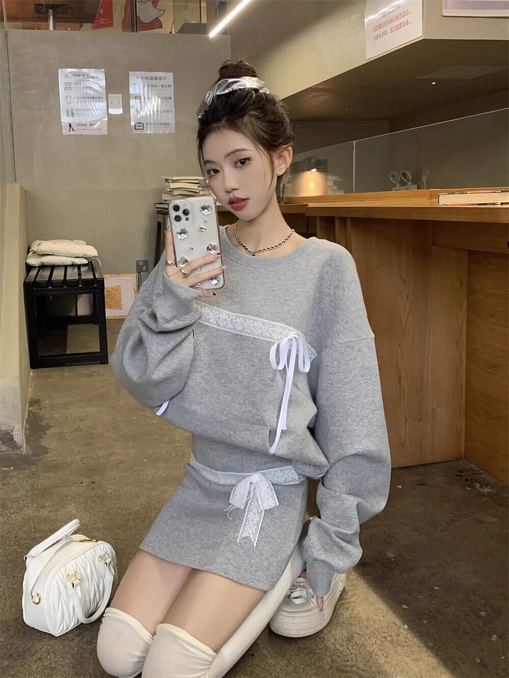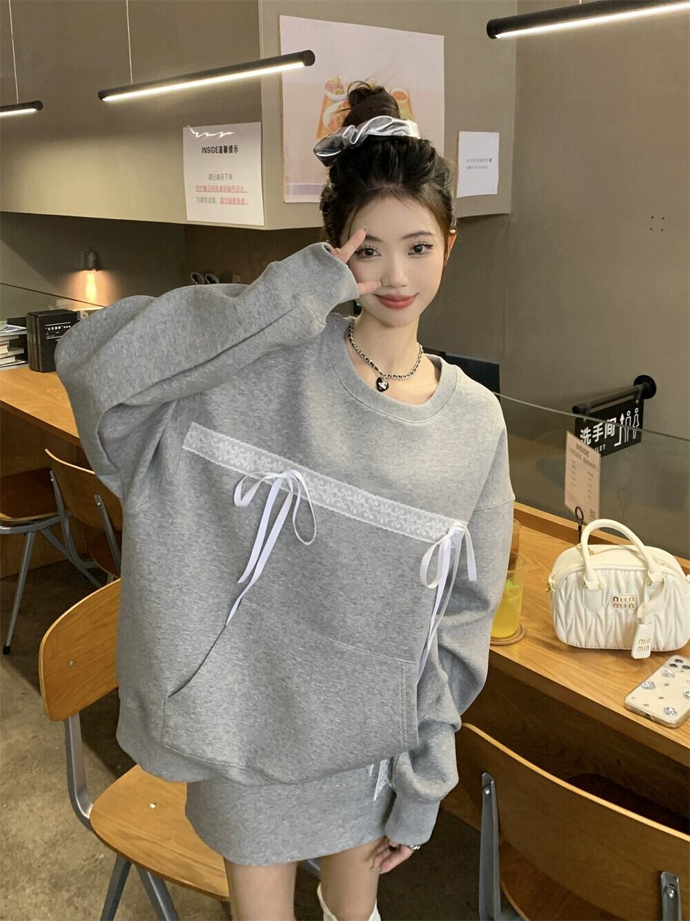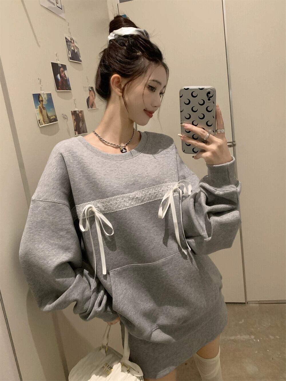 レーススプライシングトレーナー女性秋と冬 2024 新しいカレッジスタイルのレースの弓甘い長袖トップジャケット ロング リボン 大人ガーリー スウィート キュート カジュアル オータム 秋物 ウィンター 冬物 8571646611758670