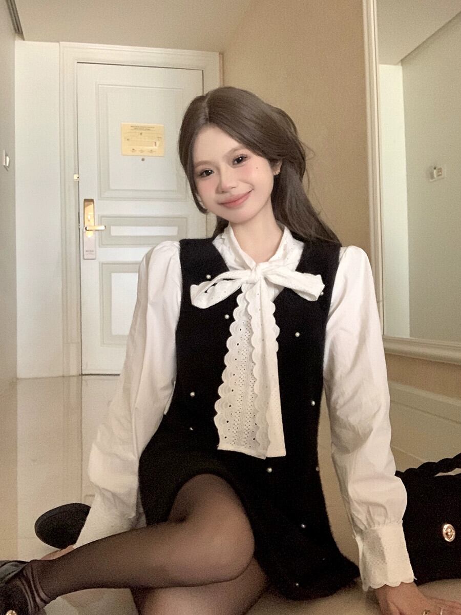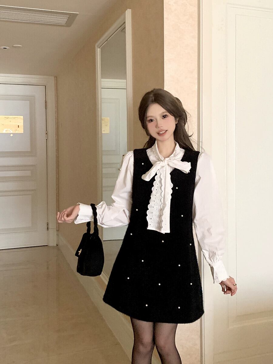 Xiaoxiangfeng ウールパールベストドレス女性の秋冬 2024 ブラックゴールドのようなショートスカートトレンディ オータム 秋物 ウィンター 冬物 真珠 8571633860952365
