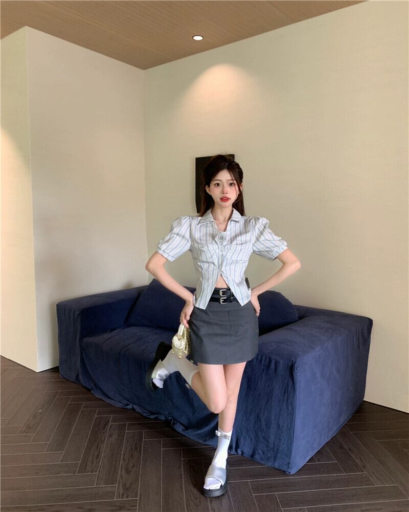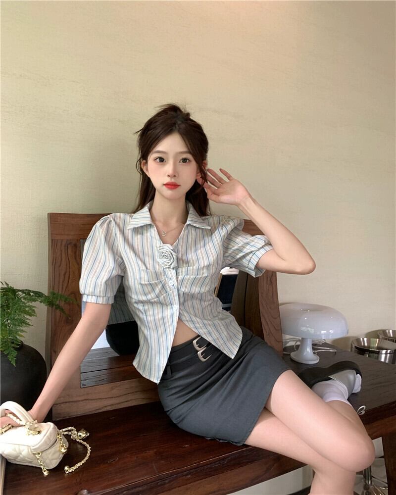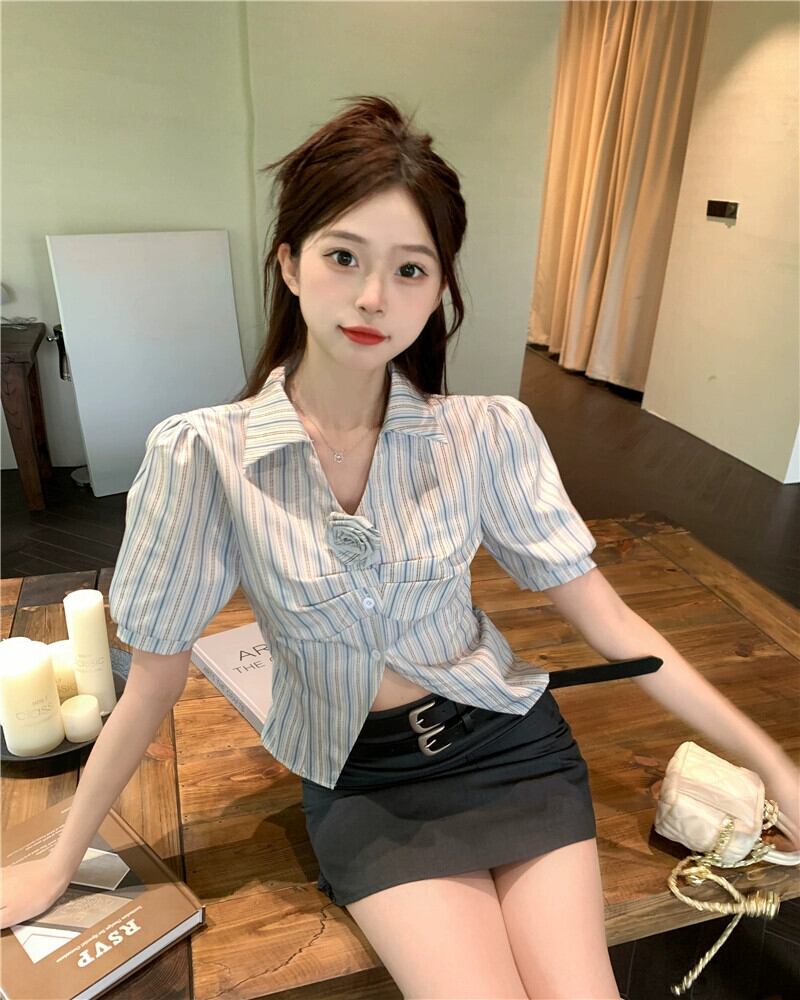 春と秋のフレンチコントラストストライプVネック立体フラワーシャツ女性、ウエストスリム長袖シャツトップ ロング スプリング 春物 オータム 秋物 フラワーデザイン 8571691396099205