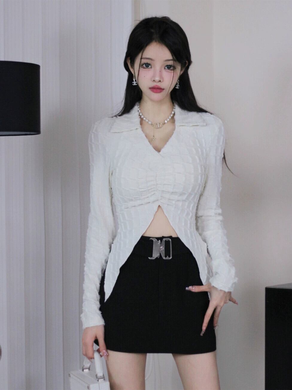 純粋な欲望ホットガール V ネック長袖シャツ女性の春 2024 スリムフィットチェック柄シャツ気質ショートトップ ロング スプリング 春物 Vネック 8571695218161160
