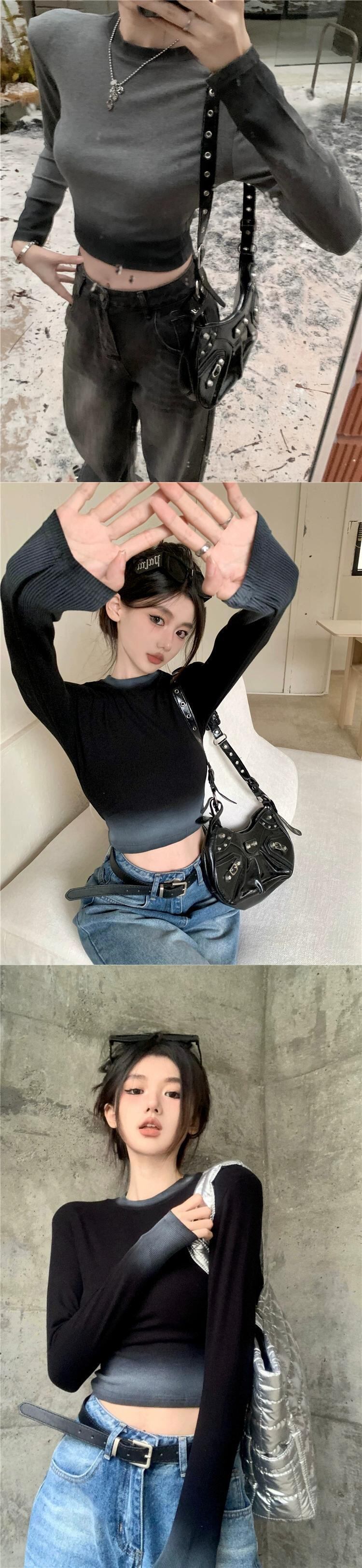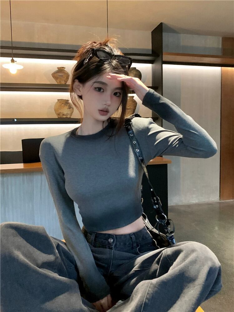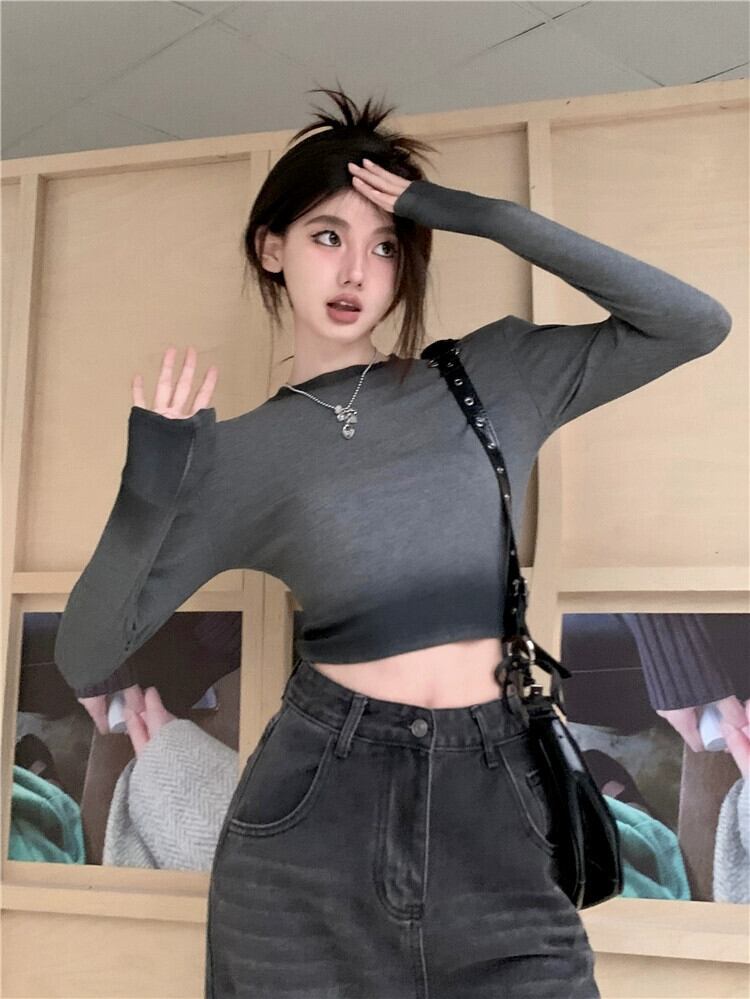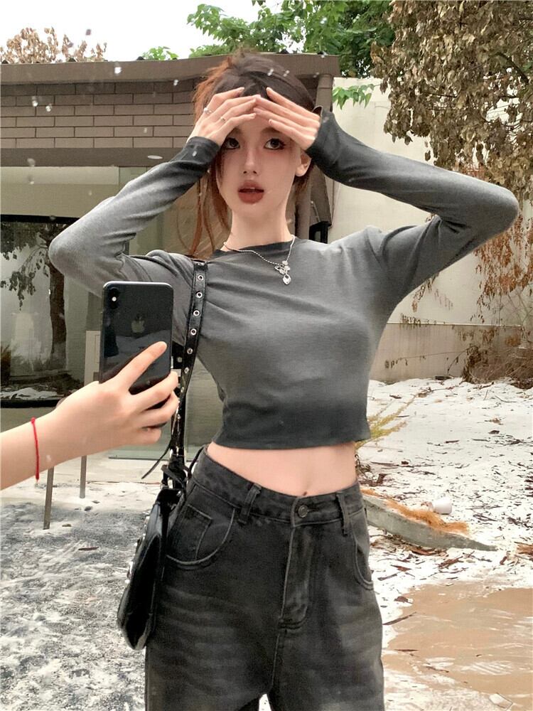 コントラストカラーの長袖 T シャツ レディース、秋のインナー レイヤリング シャツ、アメリカン レトロ スリム フィット、へそ出しショート トップ ロング オータム 秋物 Tシャツ 8571661472006252