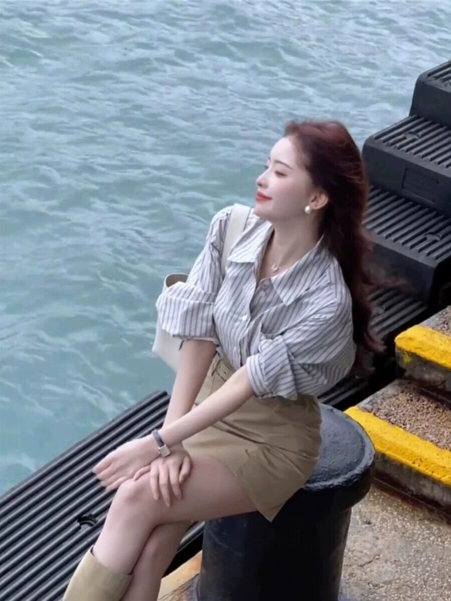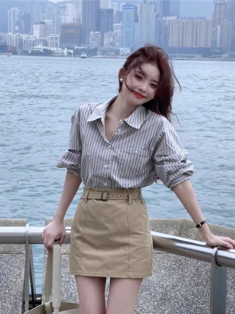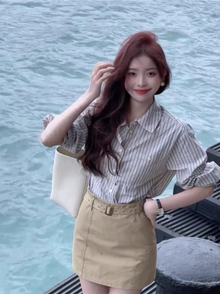 フレンチブルーストライプシャツ女性 2024 春の新デザインニッチスタイルレイヤードシャツルーズトップ レッド スプリング 春物 8571633361541516
