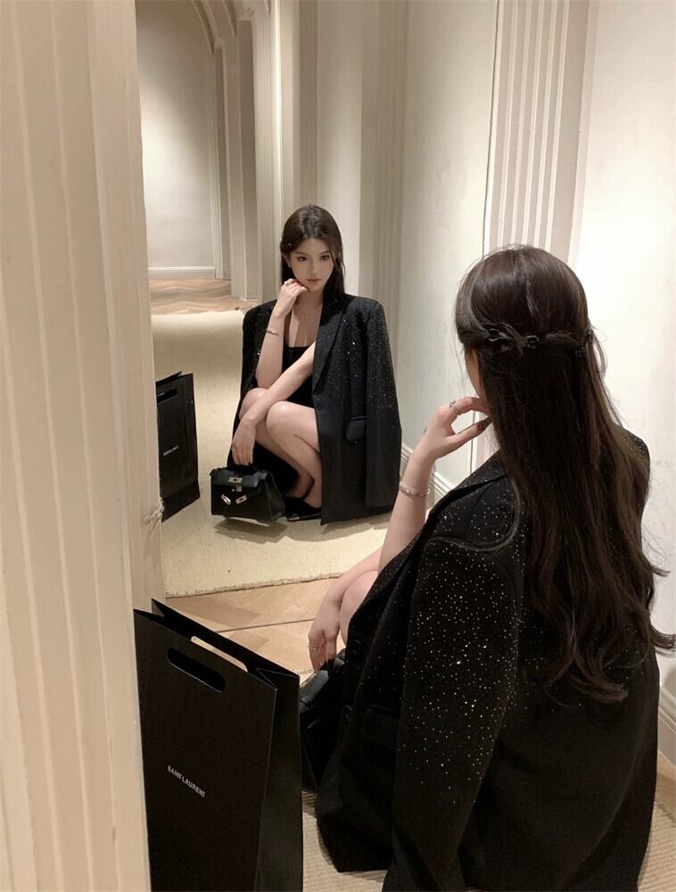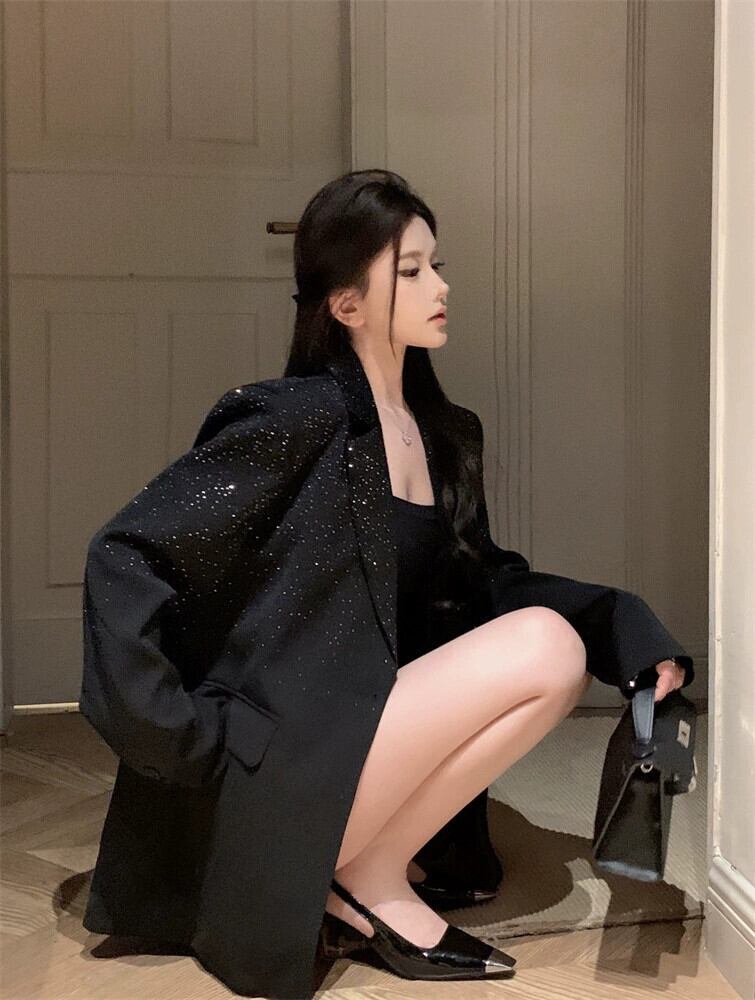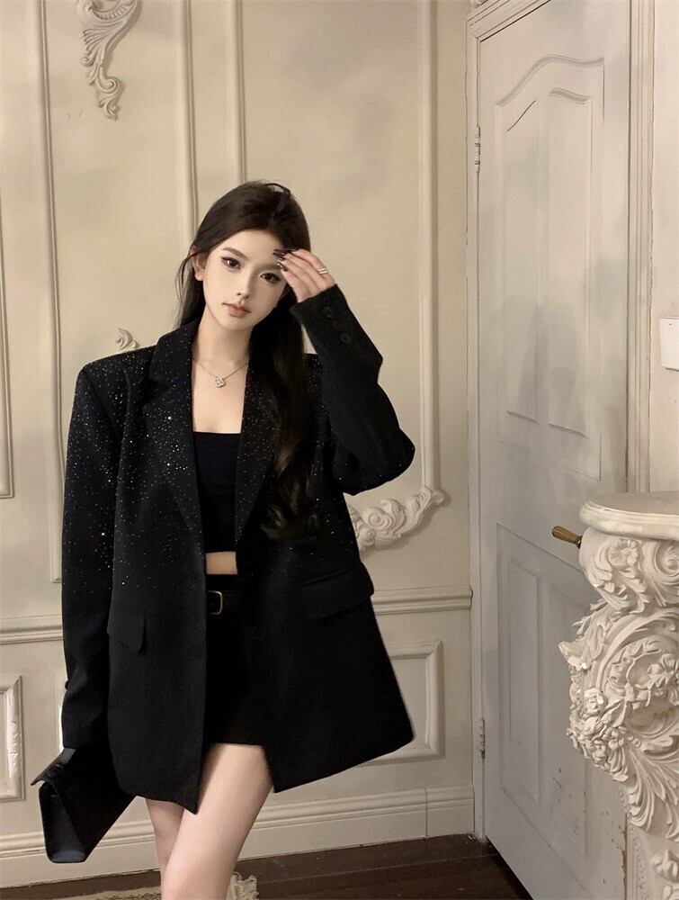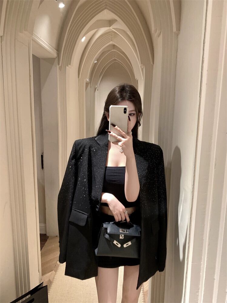 光沢のあるダイヤモンドのスーツジャケットの女性 2024 年秋の新しいハイエンドのルーズでスリムな黒のスーツトップ ブラック オータム 秋物 8571628053331349