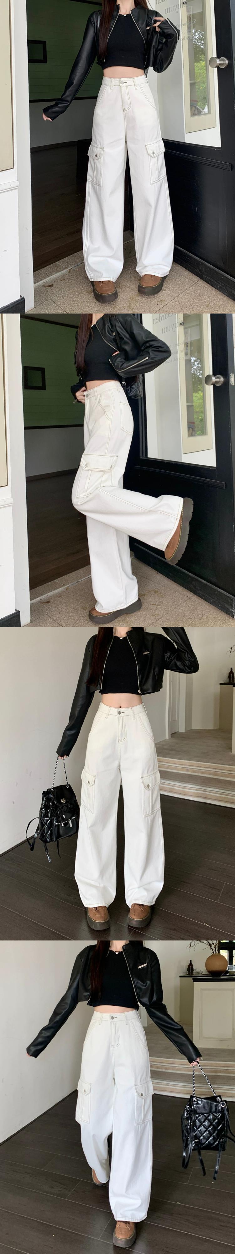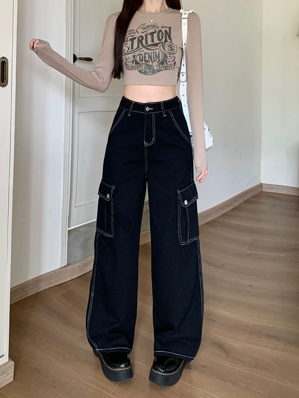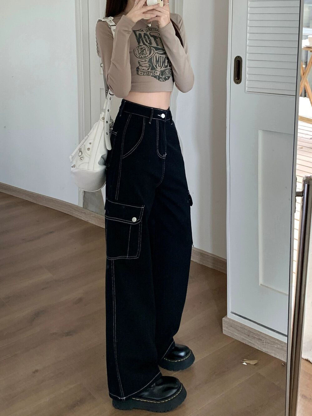 ブラックワークジーンズレディース、秋アメリカンレトロワイドレッグパンツ2024新しいルーズハイウエストフロアレングスパンツ オータム 秋物 8571662591732938