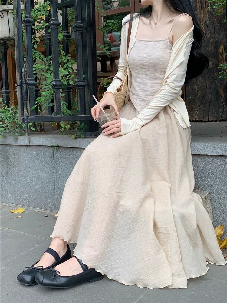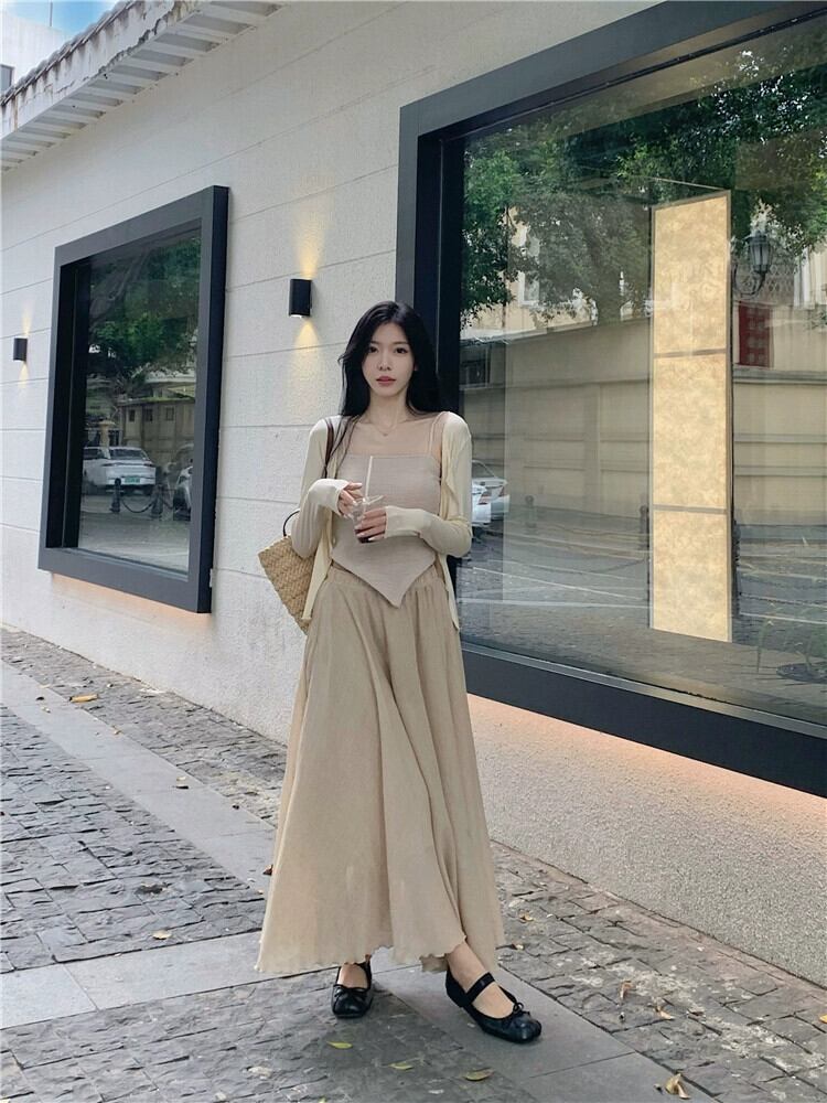 色:アプリコットスリング,ベージュのスカート,アプリコットカーディガン