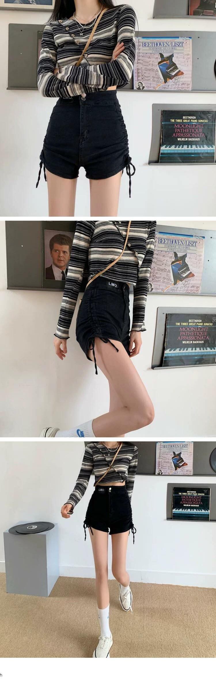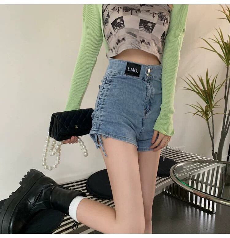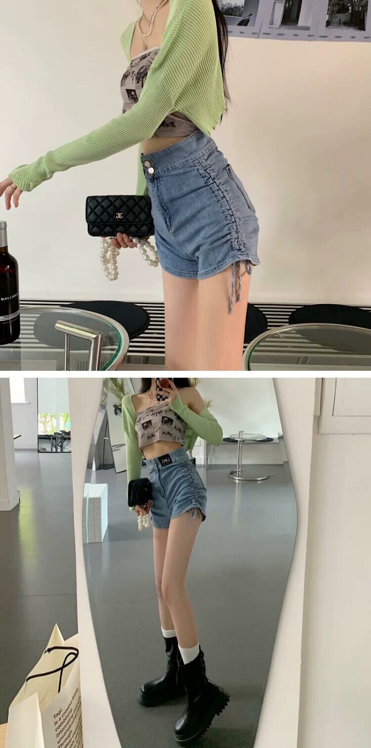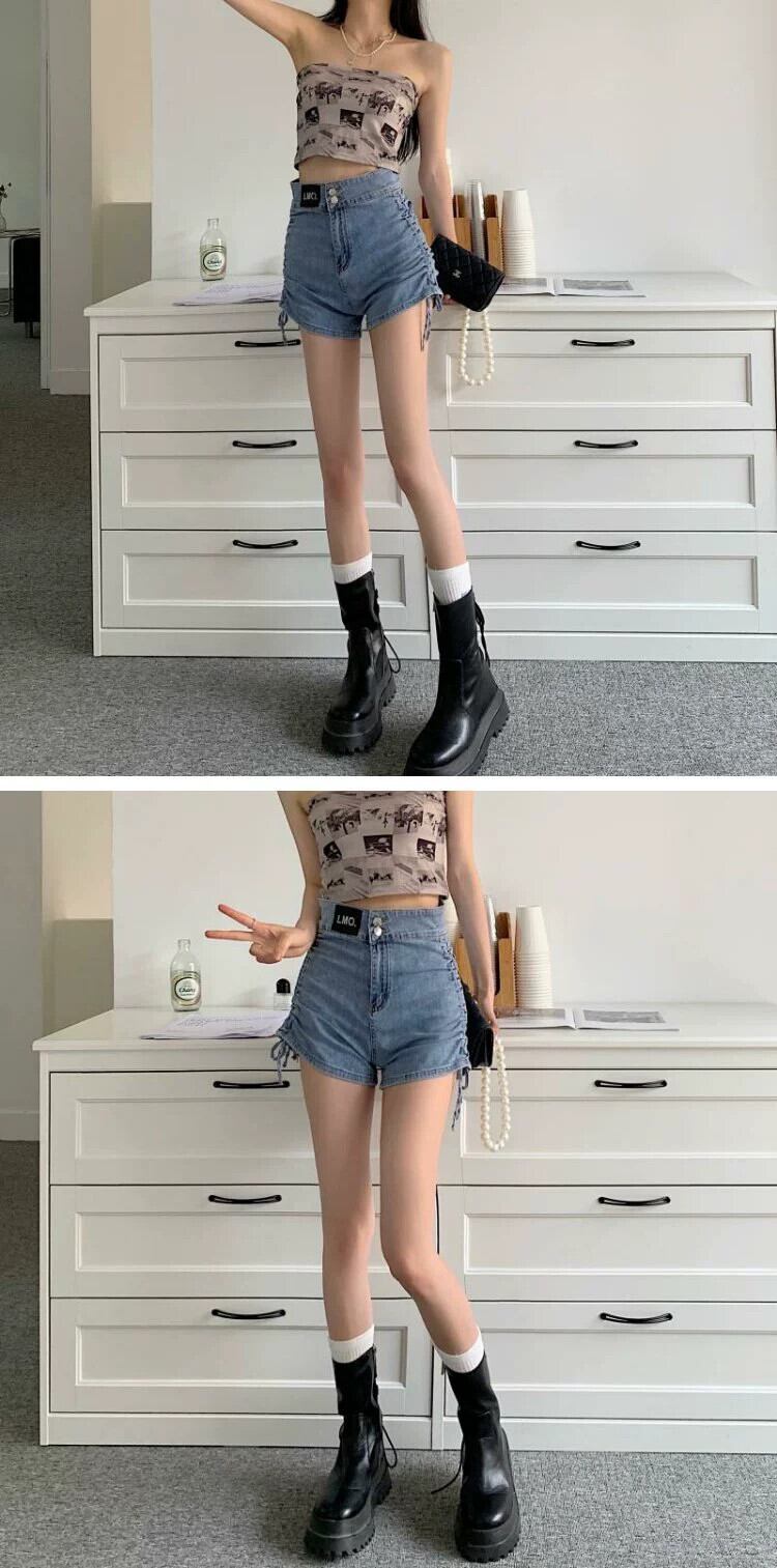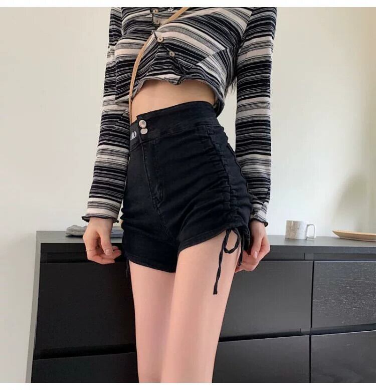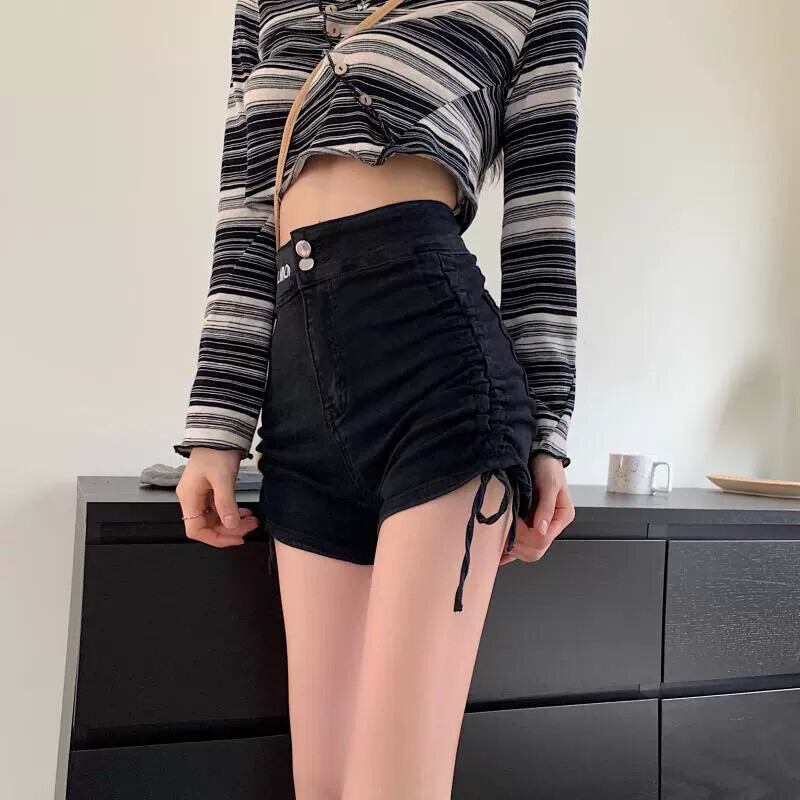 ホットガールデニムショーツ女性の夏薄い巾着甘いクール黒小さなウエスト A ラインホットパンツ ブラック 大人ガーリー スウィート キュート カジュアル サマー 夏物 ブルマー Aライン 8571614056744357