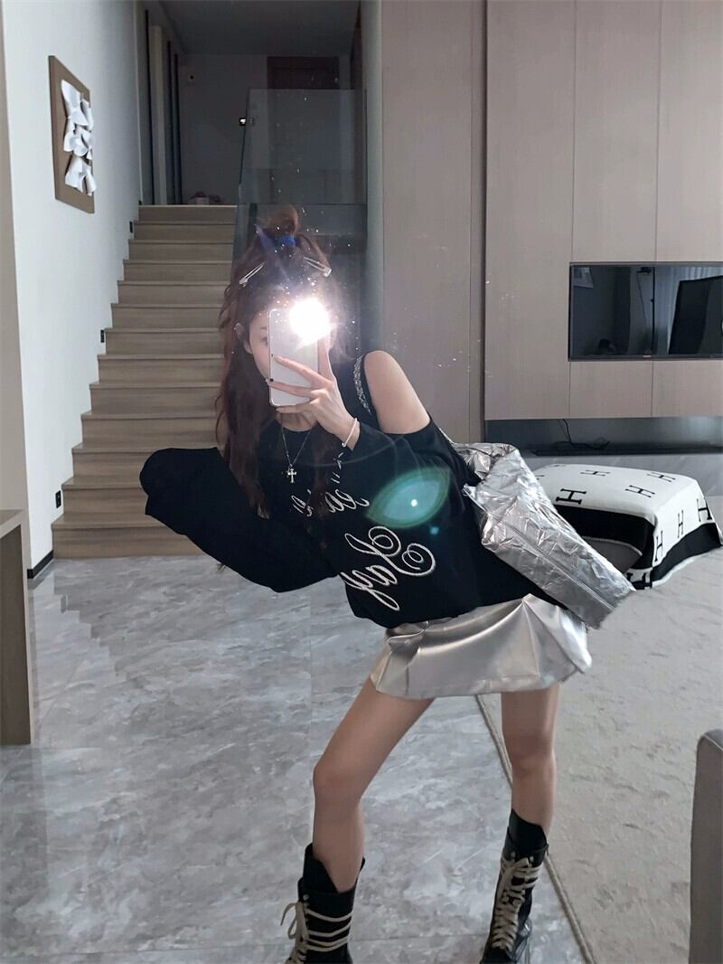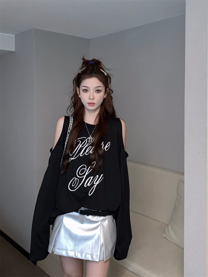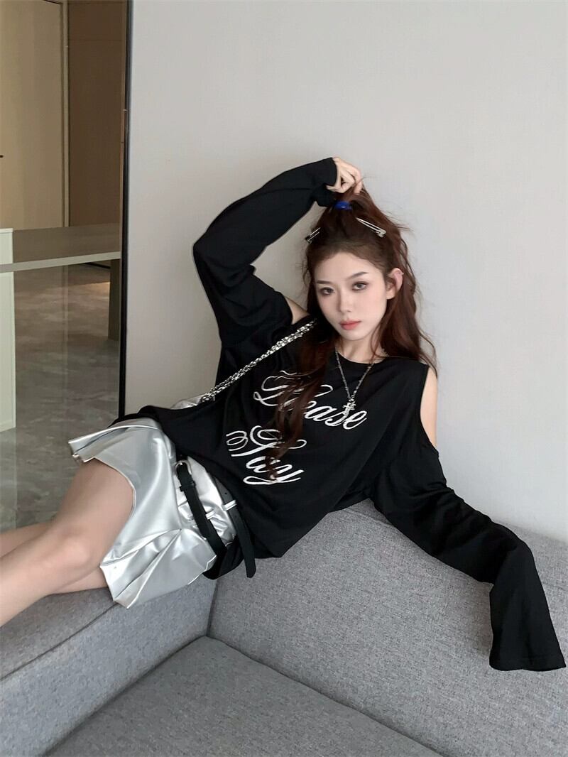 ニッチなデザインの黒の長袖Tシャツの女性、2024初秋の新しいスタイル、ファッショナブルでゆったりとしたオフショルダートップ ロング ブラック オータム 秋物 8571613515112402
