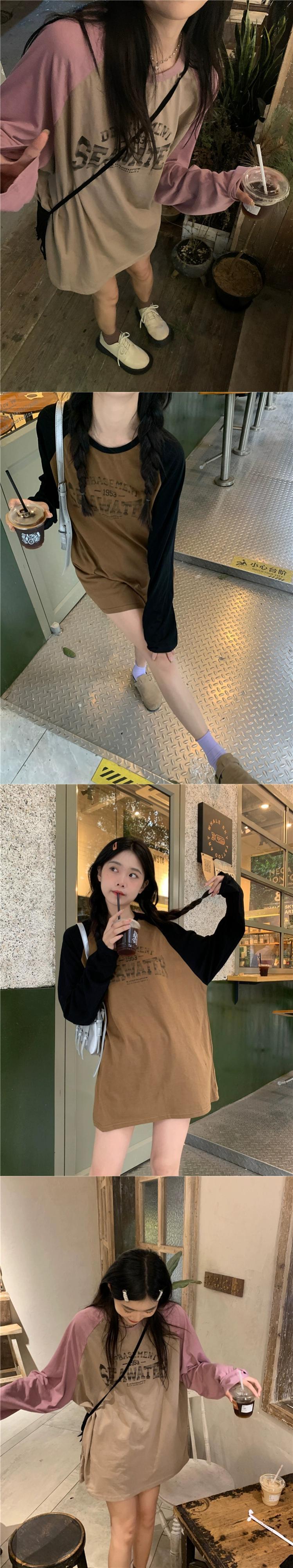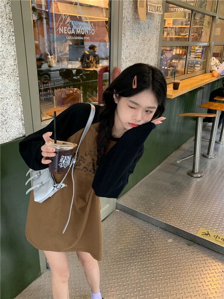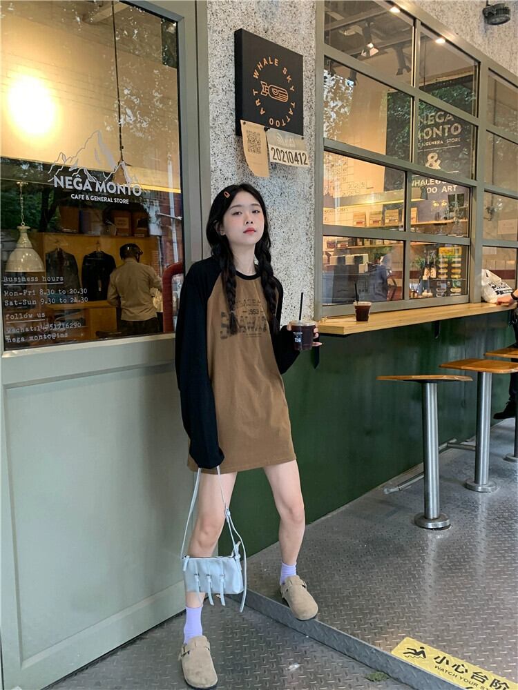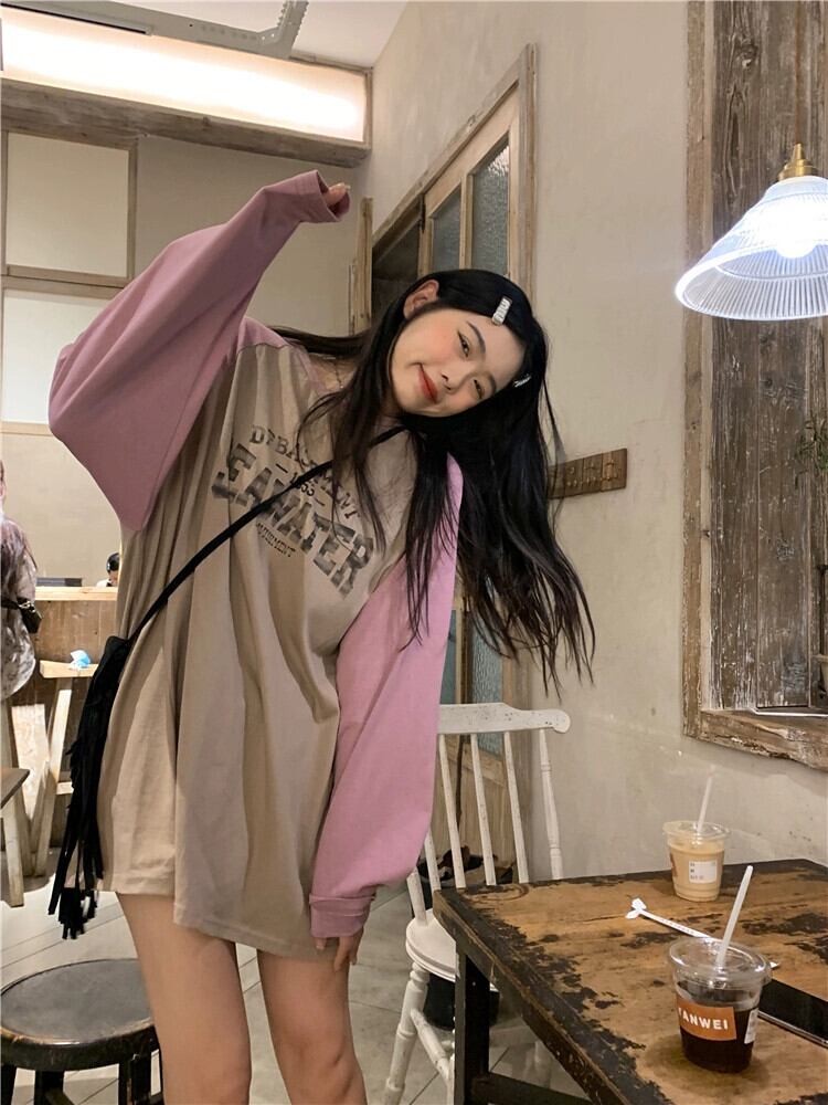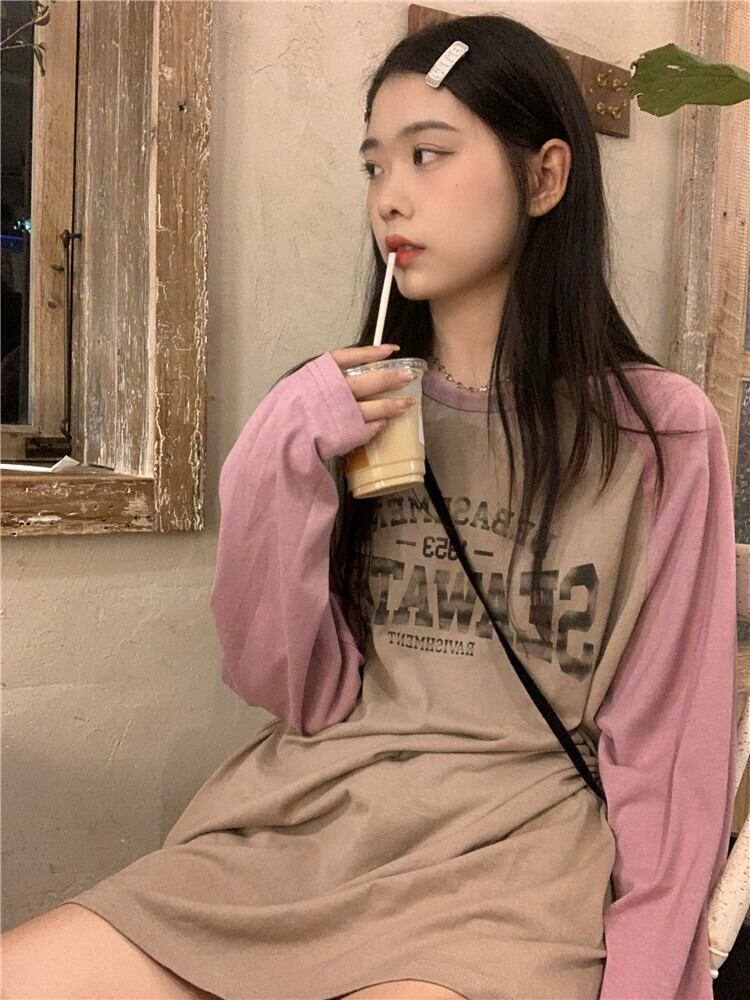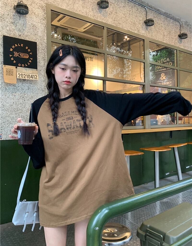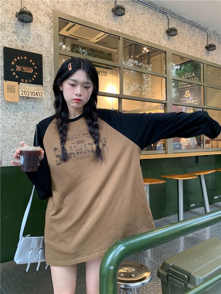 ラグラン長袖Tシャツレディースデザインニッチ2024年秋新作アメリカンレトロミドル丈お尻カバートップ ロング オータム 秋物 85716473882332