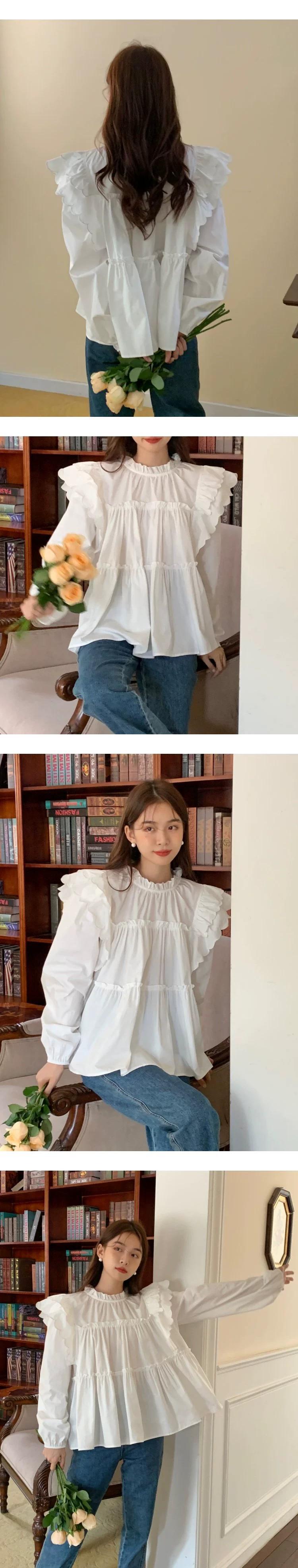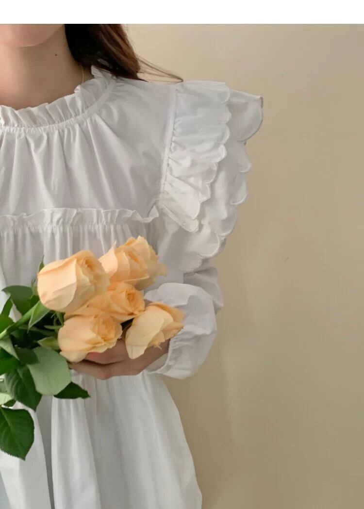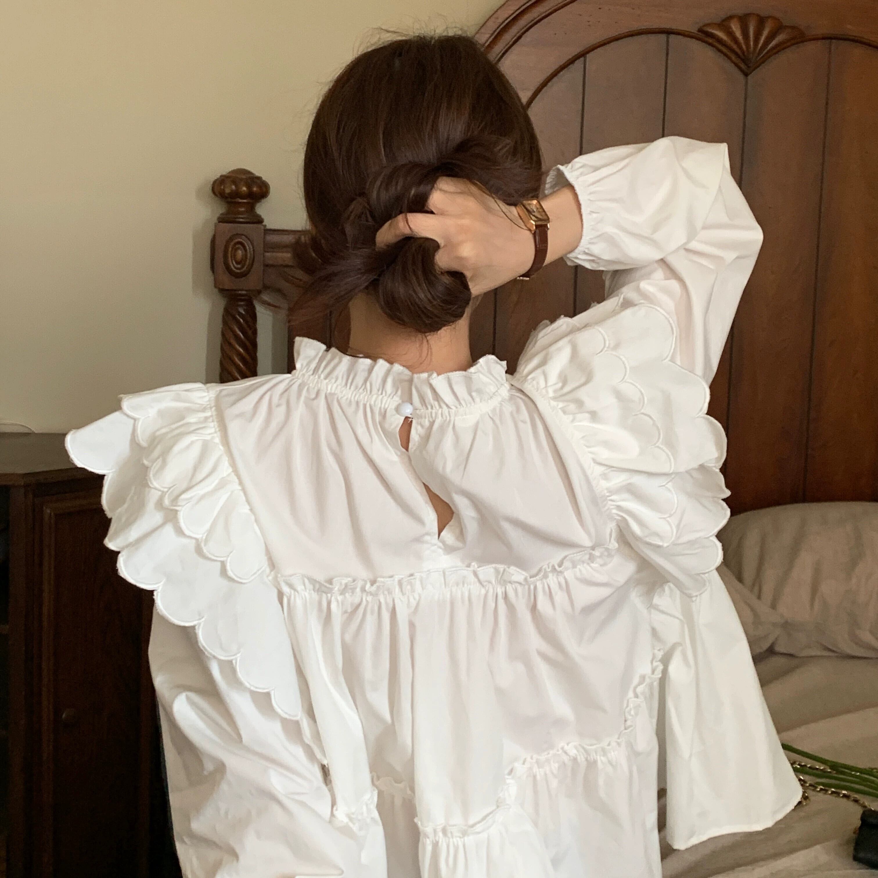 ベビードールフリルトップ女性初秋デザイン白ルーズシャツフランスの甘い気質長袖シャツ ロング ホワイト 大人ガーリー スウィート キュート カジュアル オータム 秋物 8571619527101657