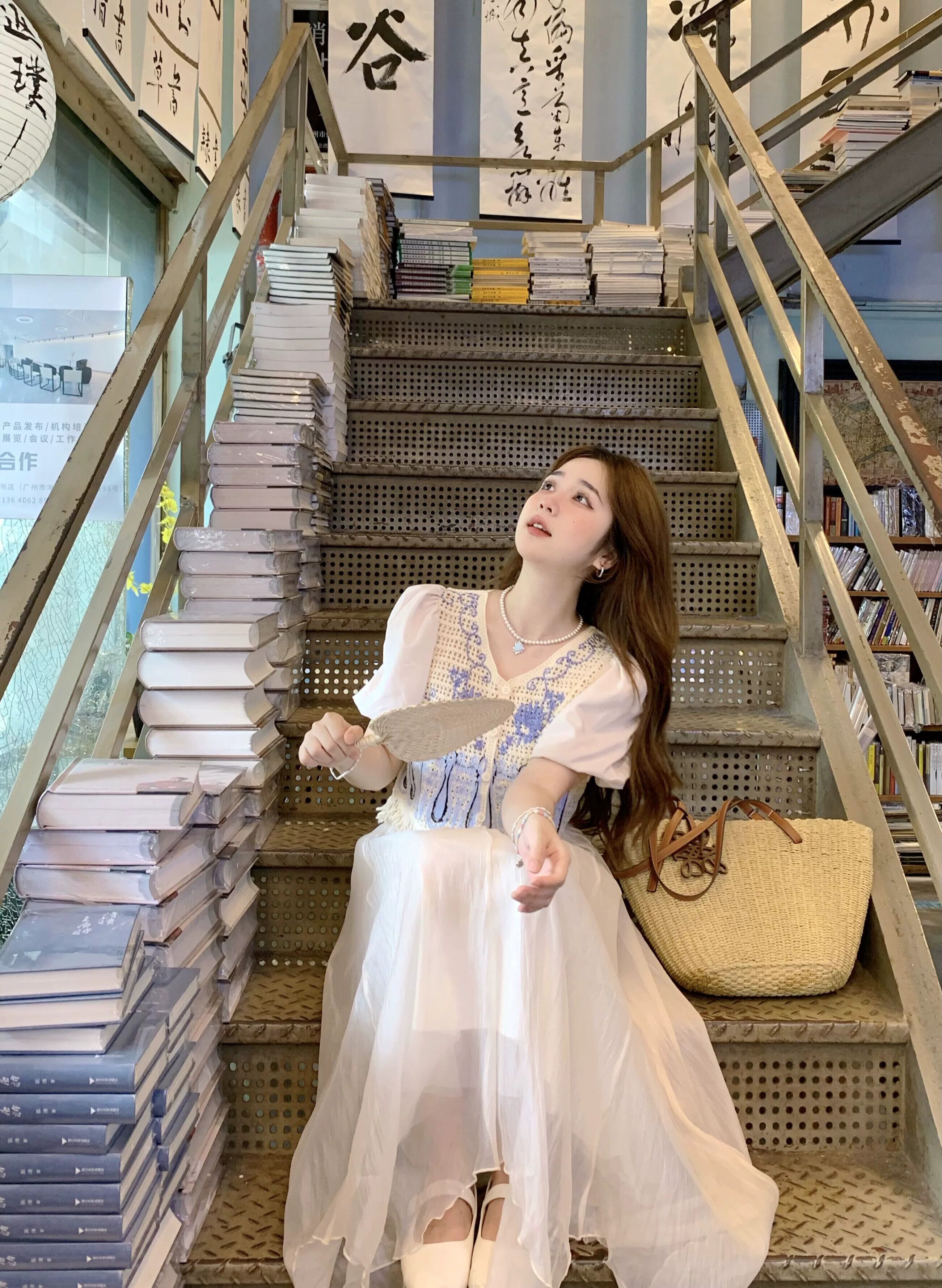 中空のかぎ針編みのテルを備えた夏のパフスリーブVネックショートトップレディース、優しくシックな美しいニット半袖半袖トップス サマー 夏物 8571650252262372