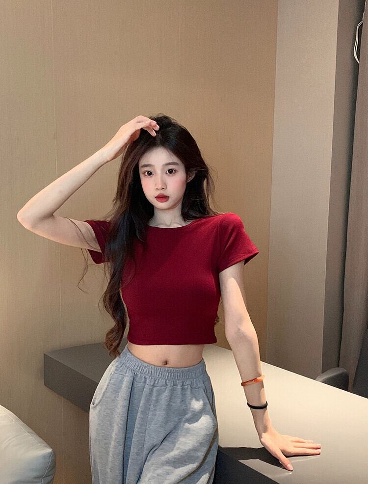 バックレスショートトップレディース夏純粋な欲望スタイルスリムハイウエストへそ露出バーガンディ右肩半袖Tシャツ ハイウェスト ハーフスリーブ サマー 夏物 ピュア 8571627836959930