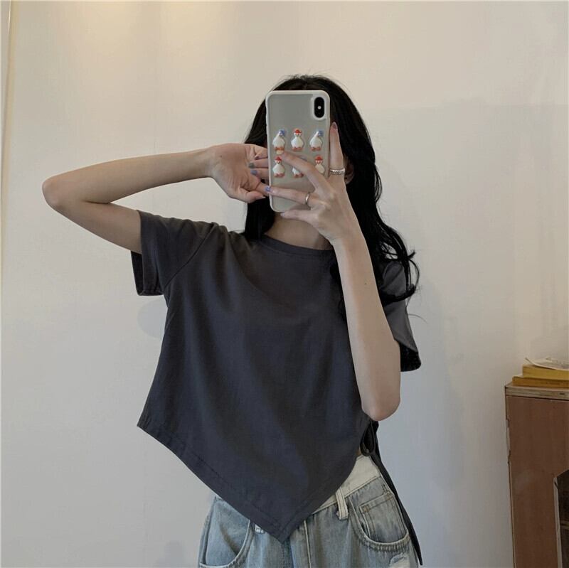 グレー不規則なスリットショートトップ女性デザインセンスニッチ夏純粋な欲望甘いネクタイ巾着半袖 Tシャツ 大人ガーリー スウィート キュート カジュアル サマー 夏物 ピュア 8571690941644550