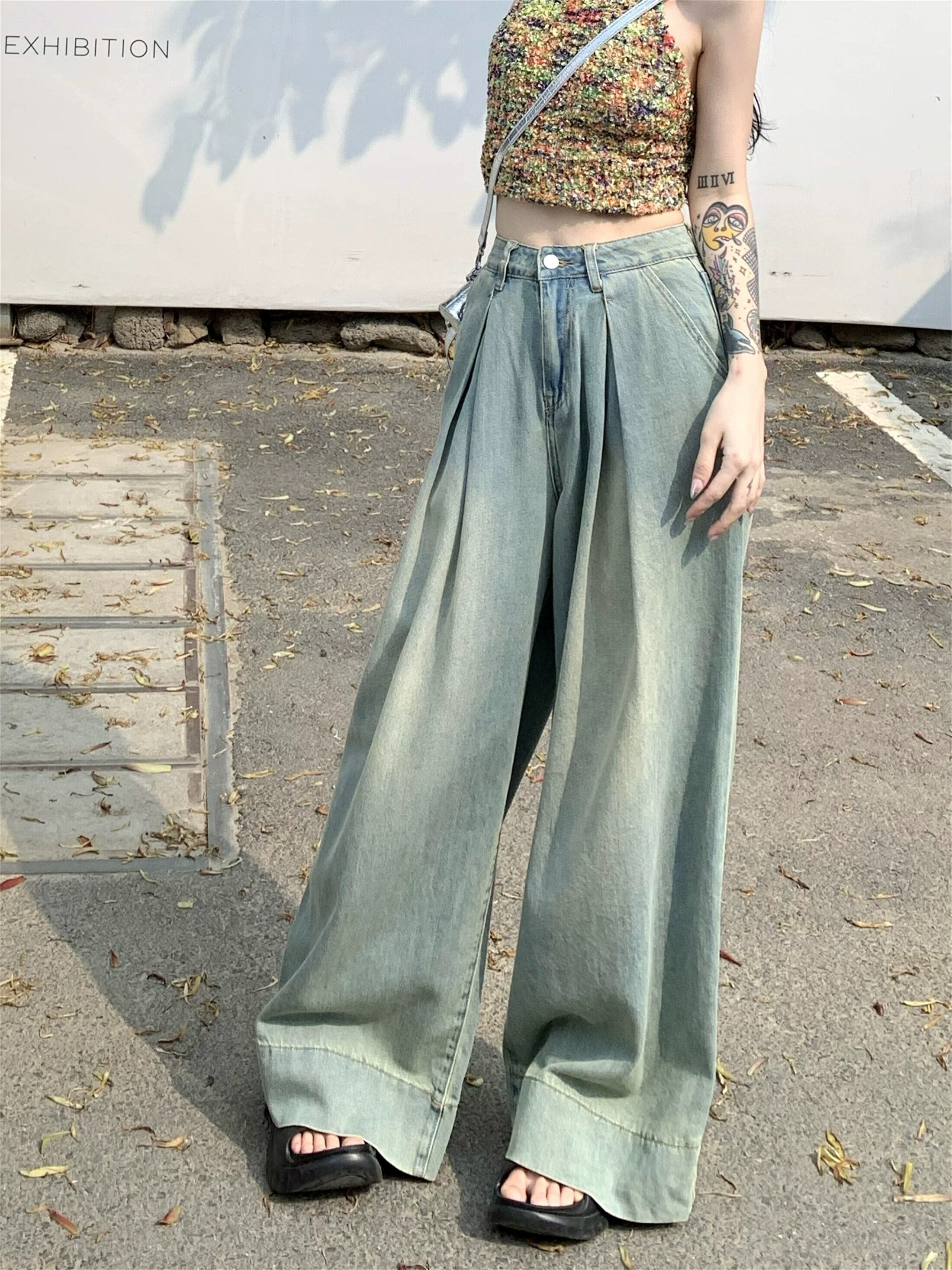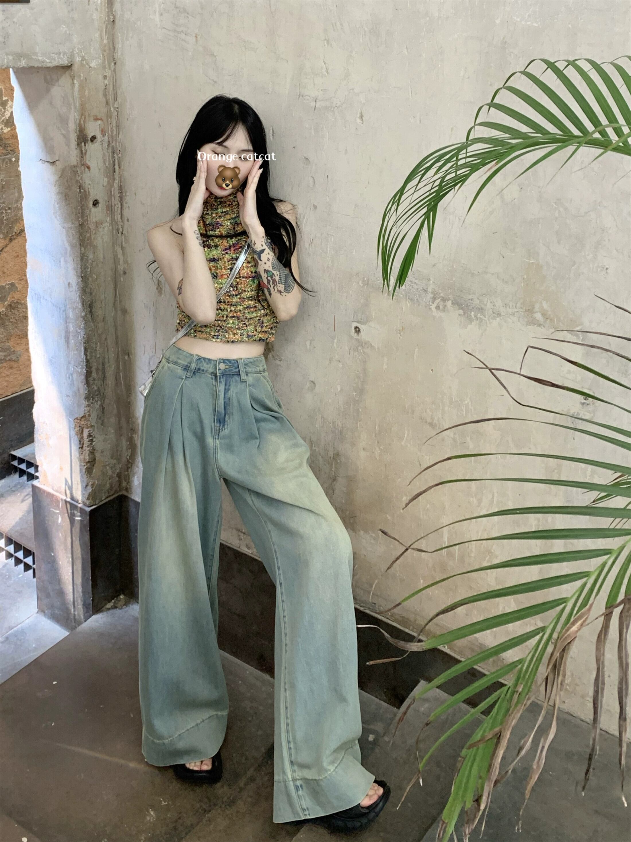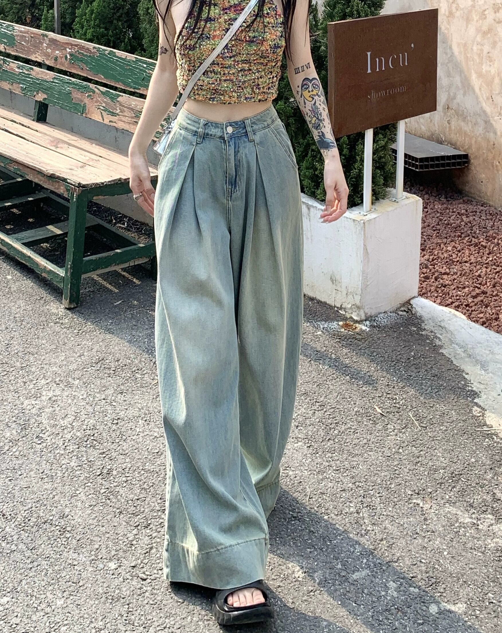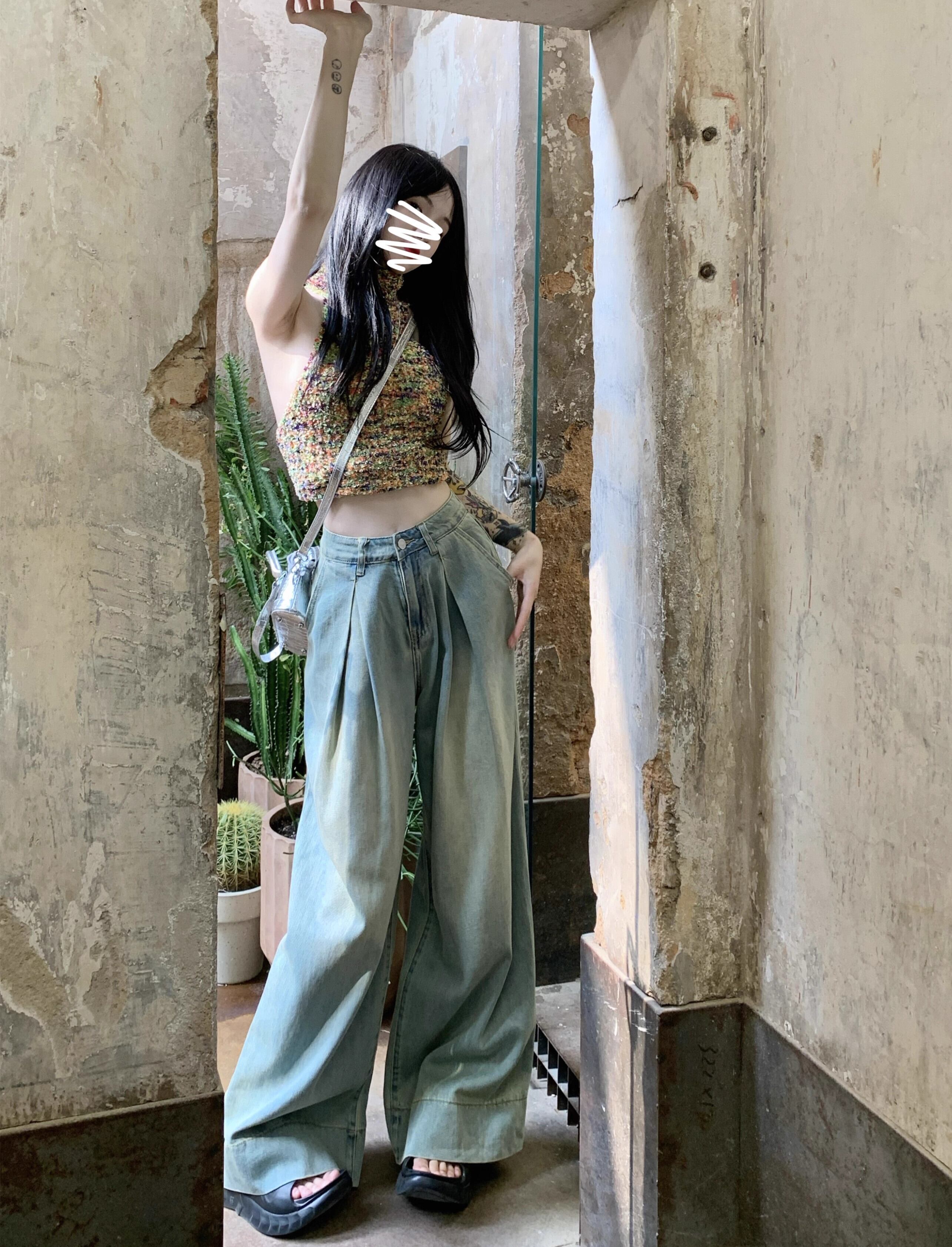 ブルーのワイドレッグジーンズの女性、ゆったりとしたストレートレッグのフロアレングスモップパンツ、2024年夏の新しいスタイル、洋ナシ型のボディパンツ小人 サマー 夏物 8571695292280553